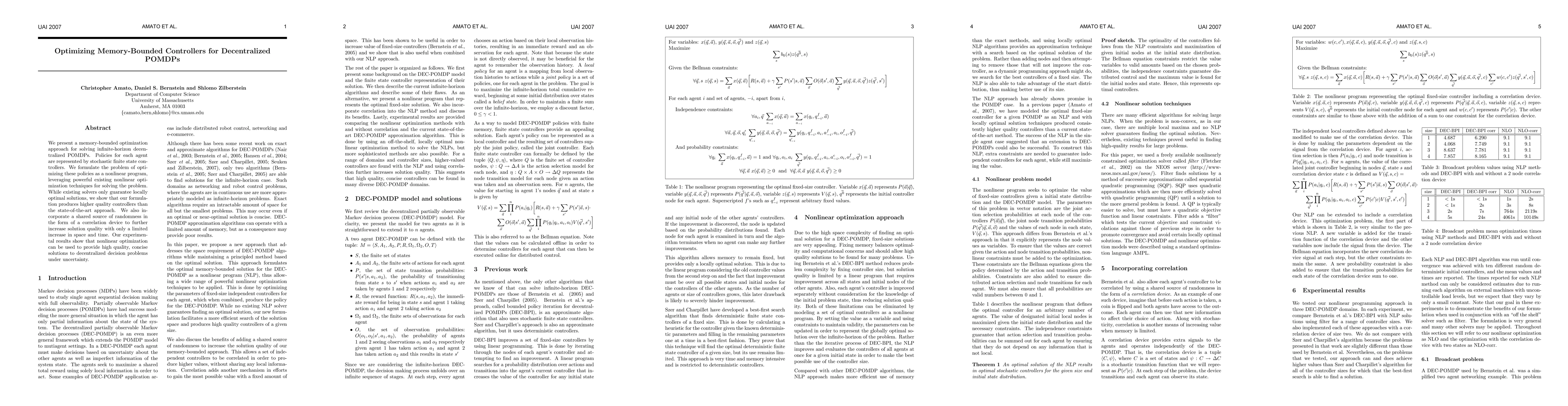 This paper proposes an optimization method for solving memory-bounded decentralized POMDPs using stochastic finite state controllers, formulated as a nonlinear program. The approach yields higher quality controllers compared to state-of-the-art, enhanced by a correlation device, demonstrating effective solutions for decentralized decision-making under uncertainty.
