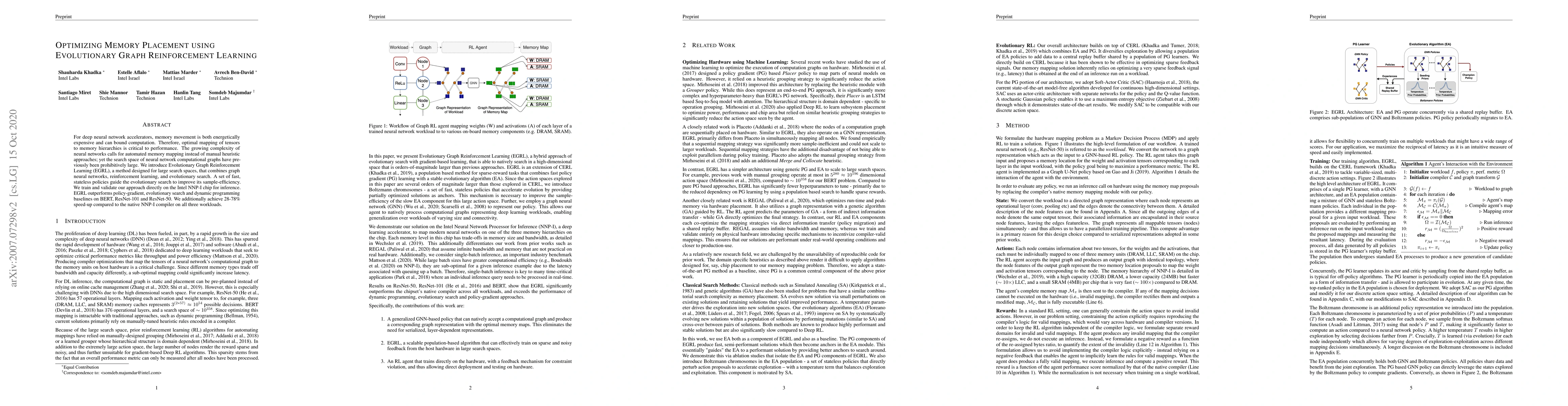 This paper introduces Evolutionary Graph Reinforcement Learning (EGRL) to optimize memory placement for deep neural networks, achieving significant speed-ups over baseline methods. EGRL combines graph neural networks, reinforcement learning, and evolutionary search, demonstrating superior performance on BERT, ResNet-101, and ResNet-50.