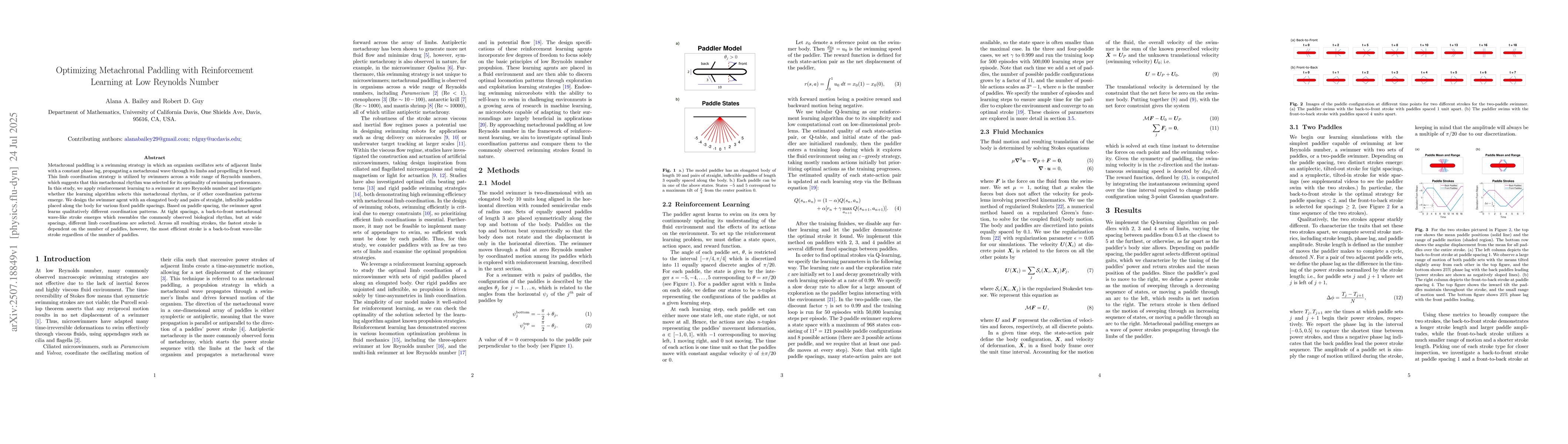 Metachronal paddling is a swimming strategy in which an organism oscillates sets of adjacent limbs with a constant phase lag, propagating a metachronal wave through its limbs and propelling it forward. This limb coordination strategy is utilized by swimmers across a wide range of Reynolds numbers, which suggests that this metachronal rhythm was selected for its optimality of swimming performance. In this study, we apply reinforcement learning to a swimmer at zero Reynolds number and investigate whether the learning algorithm selects this metachronal rhythm, or if other coordination patterns emerge. We design the swimmer agent with an elongated body and pairs of straight, inflexible paddles placed along the body for various fixed paddle spacings. Based on paddle spacing, the swimmer agent learns qualitatively different coordination patterns. At tight spacings, a back-to-front metachronal wave-like stroke emerges which resembles the commonly observed biological rhythm, but at wide spacings, different limb coordinations are selected. Across all resulting strokes, the fastest stroke is dependent on the number of paddles, however, the most efficient stroke is a back-to-front wave-like stroke regardless of the number of paddles.