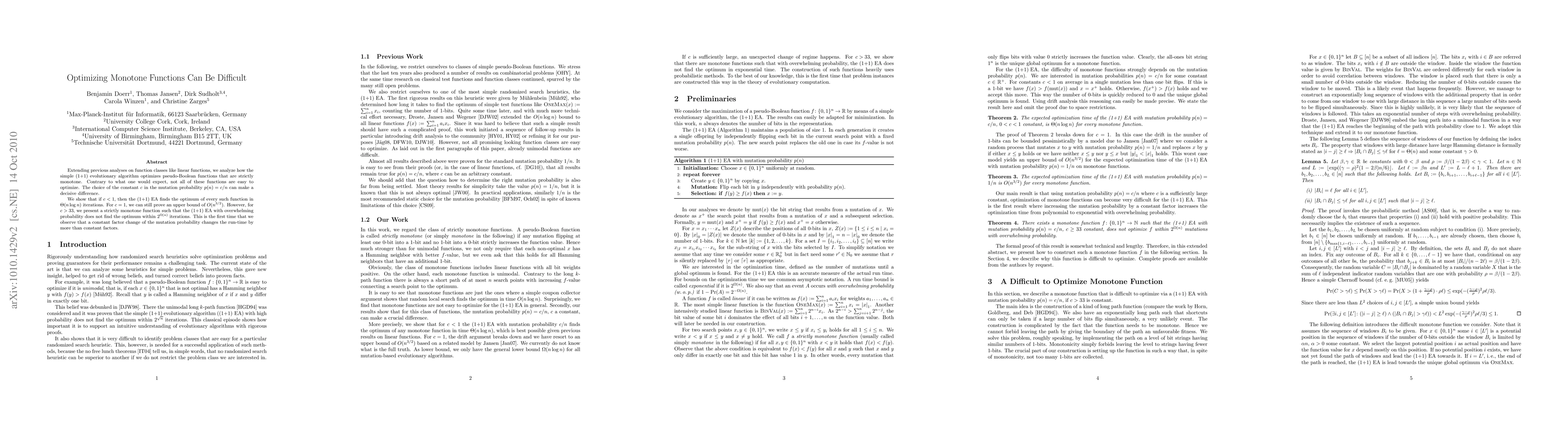 Researchers analyzed how an evolutionary algorithm optimizes pseudo-Boolean functions that are strictly monotone, finding a critical mutation probability threshold beyond which optimal solution times increase exponentially.