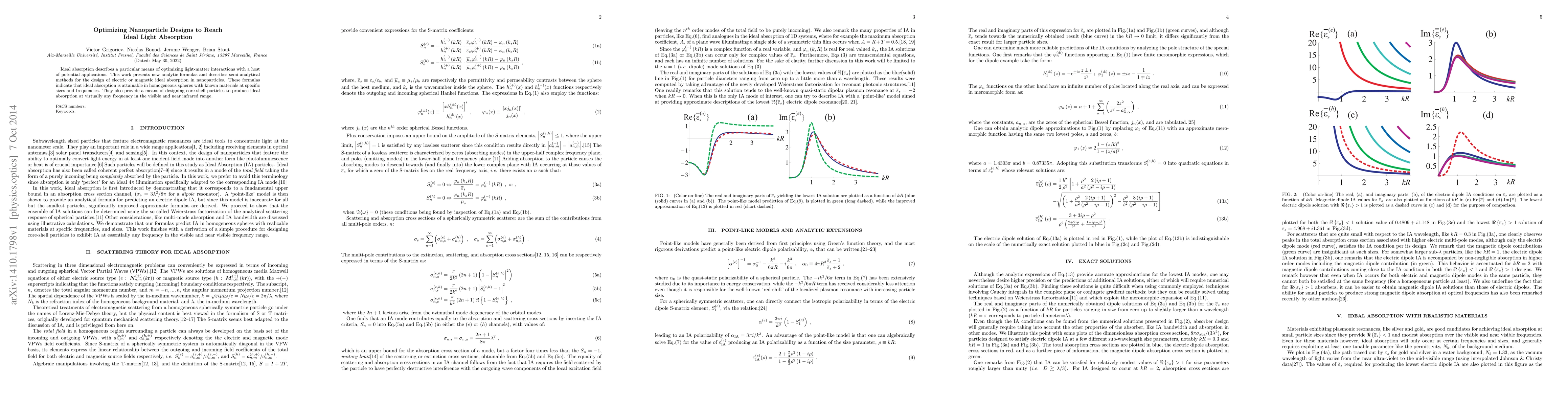 This research introduces analytic formulas and semi-analytical methods to optimize light absorption in nanoparticles, demonstrating ideal absorption in homogeneous spheres of specific sizes and materials, and enabling the design of core-shell particles for near-universal ideal absorption across visible and near-infrared frequencies.