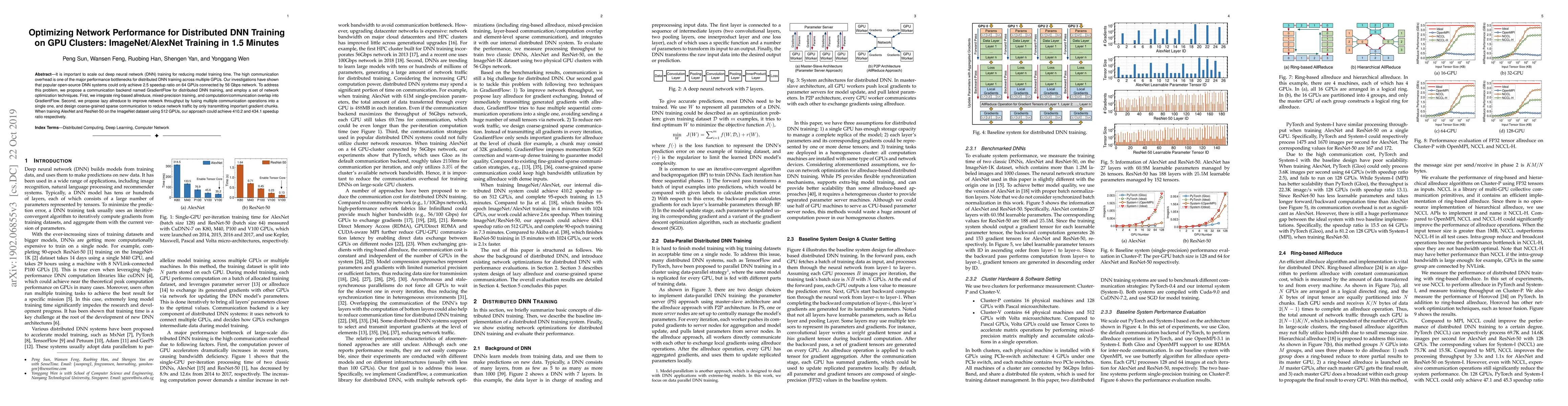 This paper proposes GradientFlow, a communication backend for optimizing distributed DNN training on GPU clusters, achieving a 410.2 speedup over existing methods and completing 95-epoch ImageNet/AlexNet training in 1.5 minutes by leveraging ring-based allreduce, mixed-precision training, and network optimization techniques.