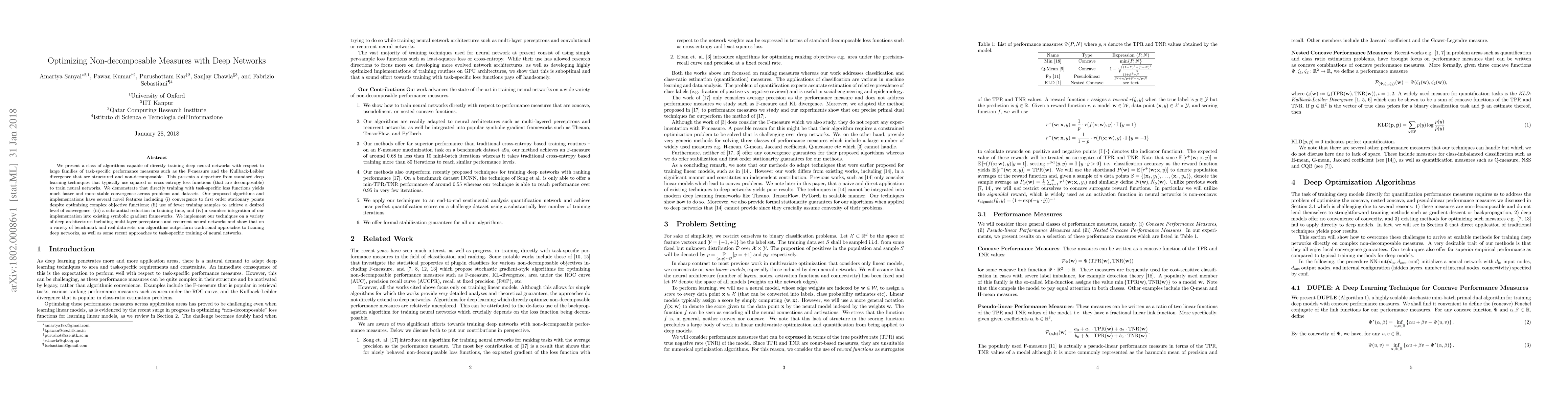 This paper introduces algorithms for training deep neural networks using non-decomposable performance measures like the F-measure and Kullback-Leibler divergence, achieving faster and more stable convergence compared to traditional methods. The proposed techniques also require fewer samples, reduce training time, and integrate seamlessly with existing gradient frameworks.