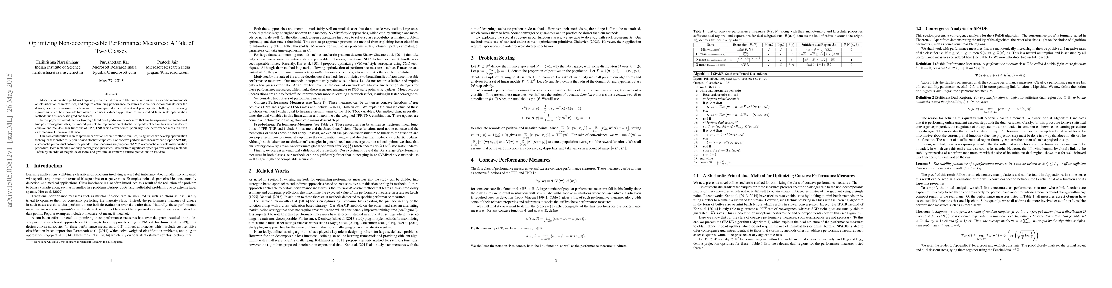 Modern classification problems frequently present mild to severe label imbalance as well as specific requirements on classification characteristics, and require optimizing performance measures that are non-decomposable over the dataset, such as F-measure. Such measures have spurred much interest and pose specific challenges to learning algorithms since their non-additive nature precludes a direct application of well-studied large scale optimization methods such as stochastic gradient descent. In this paper we reveal that for two large families of performance measures that can be expressed as functions of true positive/negative rates, it is indeed possible to implement point stochastic updates. The families we consider are concave and pseudo-linear functions of TPR, TNR which cover several popularly used performance measures such as F-measure, G-mean and H-mean. Our core contribution is an adaptive linearization scheme for these families, using which we develop optimization techniques that enable truly point-based stochastic updates. For concave performance measures we propose SPADE, a stochastic primal dual solver; for pseudo-linear measures we propose STAMP, a stochastic alternate maximization procedure. Both methods have crisp convergence guarantees, demonstrate significant speedups over existing methods - often by an order of magnitude or more, and give similar or more accurate predictions on test data.