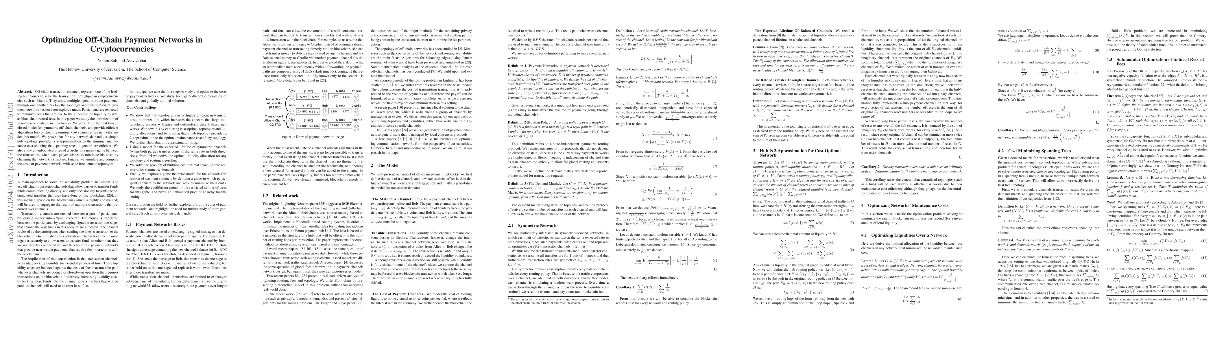 This paper optimizes off-chain payment networks in cryptocurrencies, presenting a closed model for symmetric channels and efficient algorithms for minimal cost spanning trees. It demonstrates that hub topologies provide a 2-approximation for minimal maintenance costs, while highlighting an unbounded price of anarchy in a greedy game scenario.