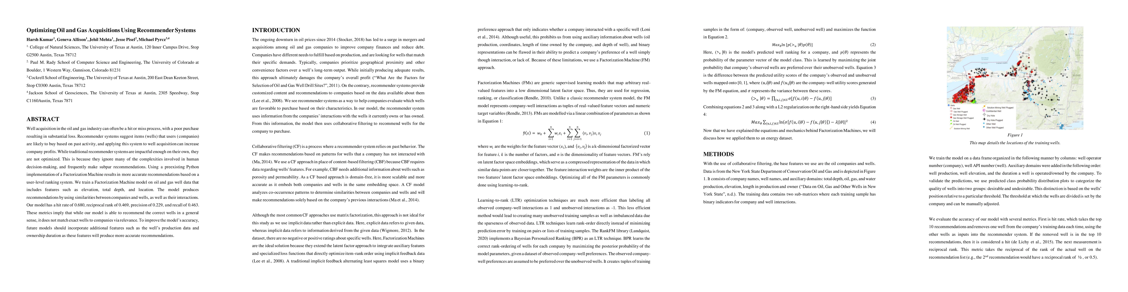 Well acquisition in the oil and gas industry can often be a hit or miss process, with a poor purchase resulting in substantial loss. Recommender systems suggest items (wells) that users (companies) are likely to buy based on past activity, and applying this system to well acquisition can increase company profits. While traditional recommender systems are impactful enough on their own, they are not optimized. This is because they ignore many of the complexities involved in human decision-making, and frequently make subpar recommendations. Using a preexisting Python implementation of a Factorization Machine results in more accurate recommendations based on a user-level ranking system. We train a Factorization Machine model on oil and gas well data that includes features such as elevation, total depth, and location. The model produces recommendations by using similarities between companies and wells, as well as their interactions. Our model has a hit rate of 0.680, reciprocal rank of 0.469, precision of 0.229, and recall of 0.463. These metrics imply that while our model is able to recommend the correct wells in a general sense, it does not match exact wells to companies via relevance. To improve the model's accuracy, future models should incorporate additional features such as the well's production data and ownership duration as these features will produce more accurate recommendations.