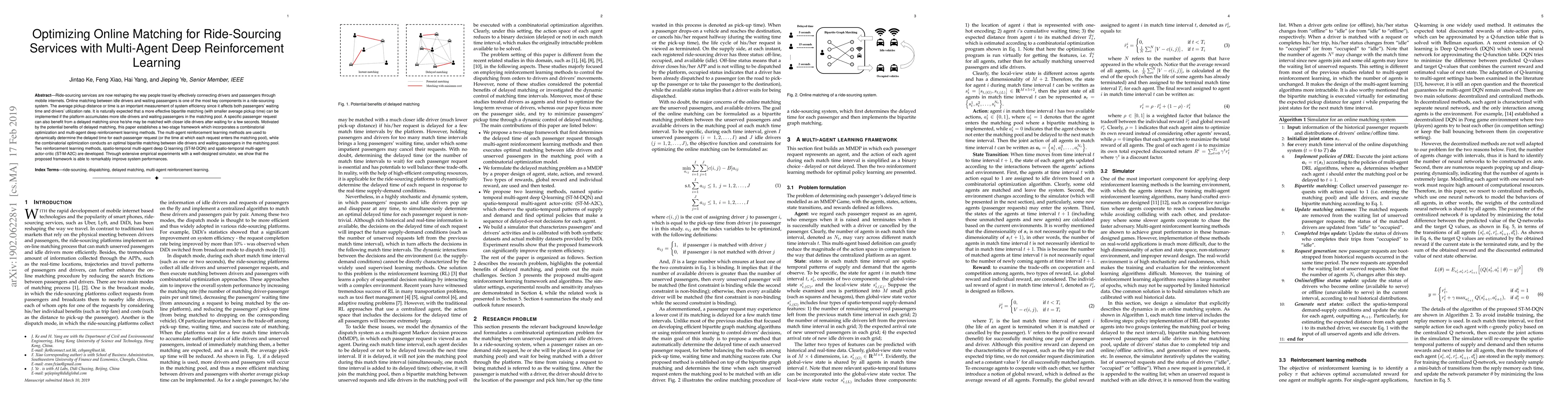 This paper proposes a two-stage framework combining combinatorial optimization and multi-agent deep reinforcement learning to optimize online matching in ride-sourcing services. The reinforcement learning methods dynamically determine the optimal delayed matching time for passenger requests, while combinatorial optimization performs optimal matching. Empirical experiments demonstrate significant performance improvements.