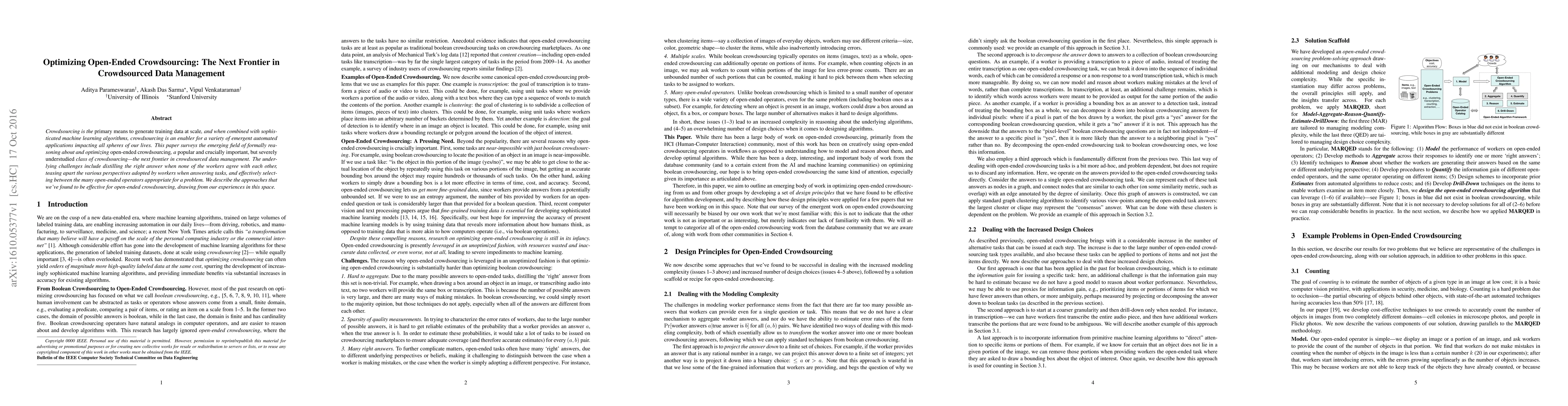 Crowdsourcing is the primary means to generate training data at scale, and when combined with sophisticated machine learning algorithms, crowdsourcing is an enabler for a variety of emergent automated applications impacting all spheres of our lives. This paper surveys the emerging field of formally reasoning about and optimizing open-ended crowdsourcing, a popular and crucially important, but severely understudied class of crowdsourcing---the next frontier in crowdsourced data management. The underlying challenges include distilling the right answer when none of the workers agree with each other, teasing apart the various perspectives adopted by workers when answering tasks, and effectively selecting between the many open-ended operators appropriate for a problem. We describe the approaches that we've found to be effective for open-ended crowdsourcing, drawing from our experiences in this space.