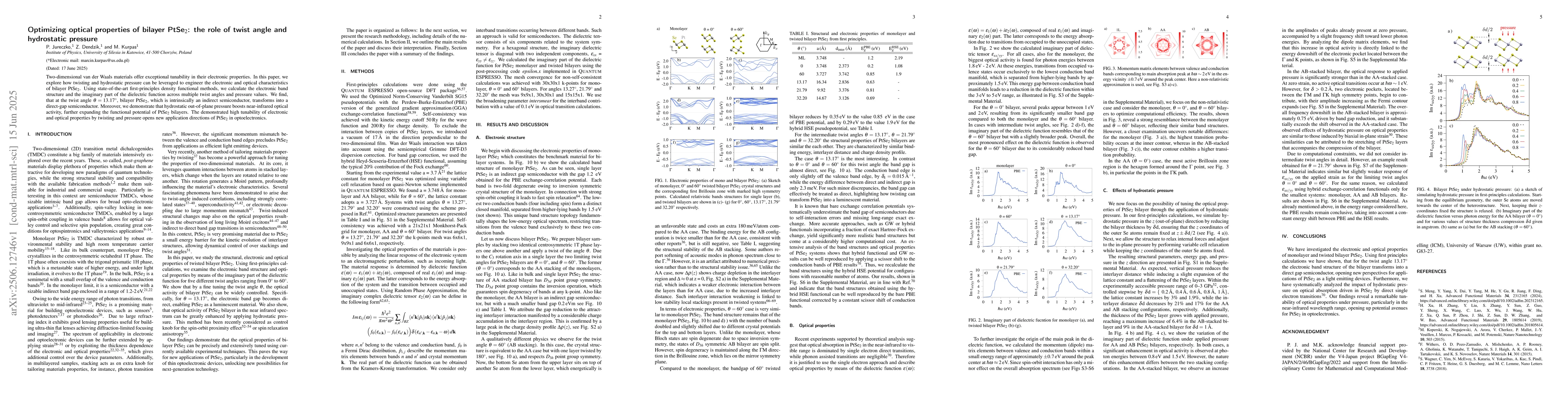 Two-dimensional van der Waals materials offer exceptional tunability in their electronic properties. In this paper, we explore how twisting and hydrostatic pressure can be leveraged to engineer the electronic and optical characteristics of bilayer PtSe$_2$. Using state-of-the-art first-principles density functional methods, we calculate the electronic band structure and the imaginary part of the dielectric function across multiple twist angles and pressure values. We find, that at the twist angle $\theta=13.17^\circ$, bilayer PtSe$_2$, which is intrinsically an indirect semiconductor, transforms into a direct-gap semiconductor. Moreover, we demonstrate that hydrostatic out-of-plane pressure boosts near-infrared optical activity, further expanding the functional potential of PtSe$_2$ bilayers. The demonstrated high tunability of electronic and optical properties by twisting and pressure opens new application directions of PtSe$_2$ in optoelectronics.