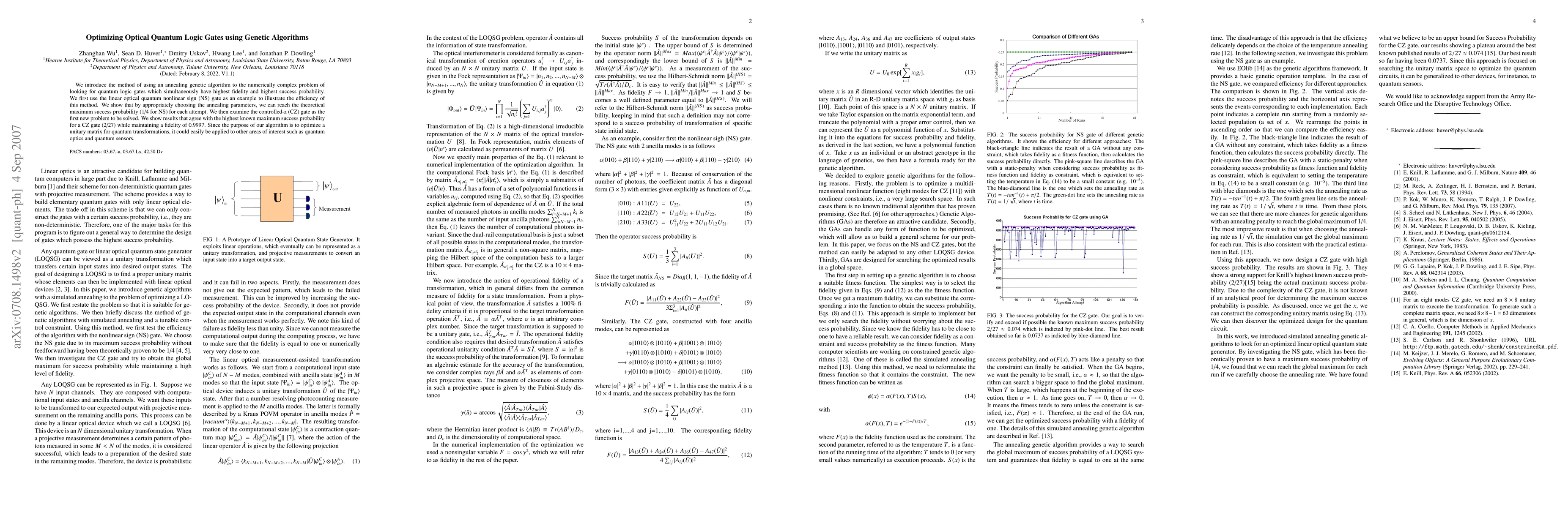 Researchers used genetic algorithms to optimize quantum logic gates for high fidelity and success probability, achieving maximums of 1/4 and 2/27 in two experiments.