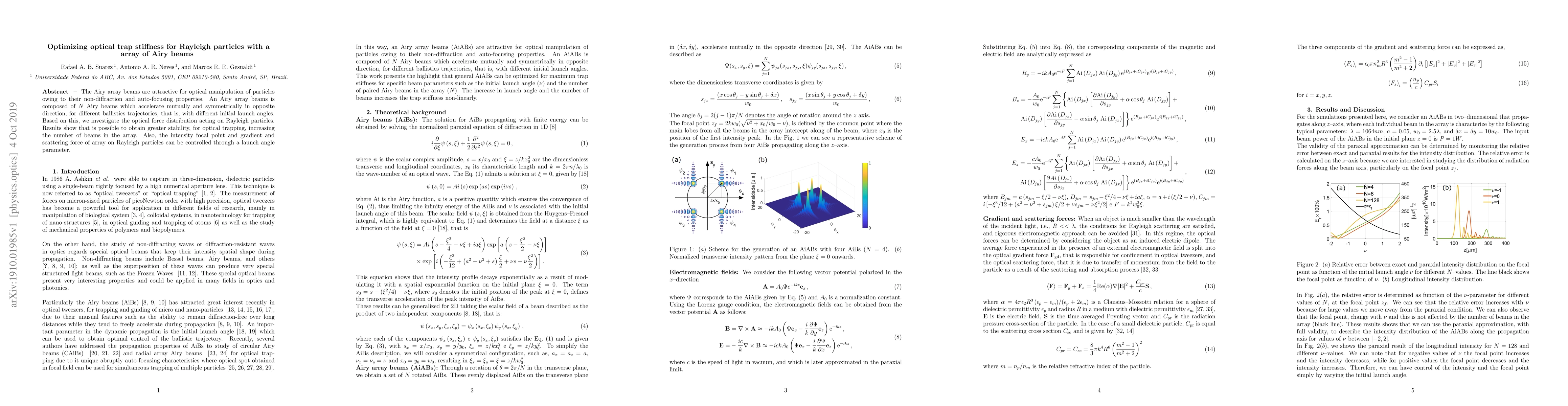 This paper explores the use of Airy array beams for optical trapping of Rayleigh particles, demonstrating that increasing the number of beams enhances trapping stability. The study reveals that the focal point intensity and gradient, as well as scattering forces, can be modulated by adjusting the launch angle of the beams.