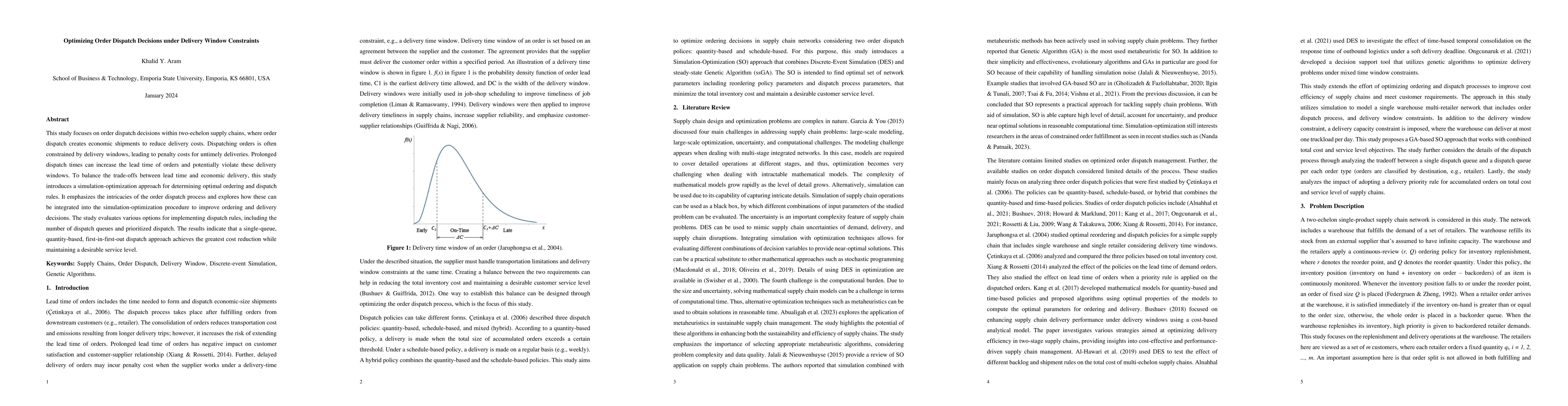 This study develops a simulation-optimization model to optimize order dispatch decisions in two-echelon supply chains under delivery window constraints, finding that a single-queue, quantity-based, first-in-first-out dispatch approach minimizes costs while maintaining service levels.