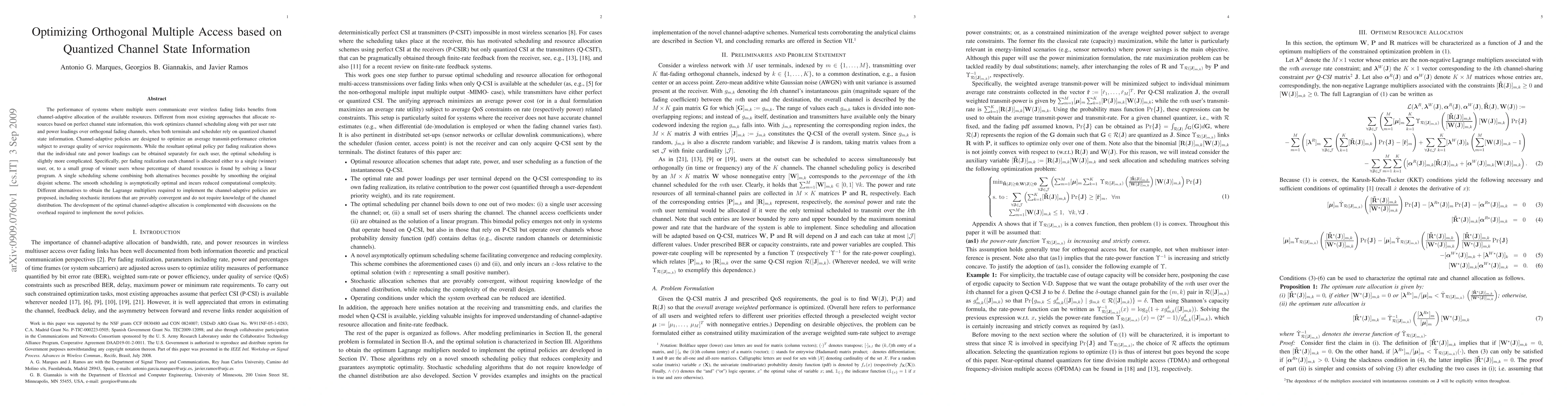 The performance of systems where multiple users communicate over wireless fading links benefits from channel-adaptive allocation of the available resources. Different from most existing approaches that allocate resources based on perfect channel state information, this work optimizes channel scheduling along with per user rate and power loadings over orthogonal fading channels, when both terminals and scheduler rely on quantized channel state information. Channel-adaptive policies are designed to optimize an average transmit-performance criterion subject to average quality of service requirements. While the resultant optimal policy per fading realization shows that the individual rate and power loadings can be obtained separately for each user, the optimal scheduling is slightly more complicated. Specifically, per fading realization each channel is allocated either to a single (winner) user, or, to a small group of winner users whose percentage of shared resources is found by solving a linear program. A single scheduling scheme combining both alternatives becomes possible by smoothing the original disjoint scheme. The smooth scheduling is asymptotically optimal and incurs reduced computational complexity. Different alternatives to obtain the Lagrange multipliers required to implement the channel-adaptive policies are proposed, including stochastic iterations that are provably convergent and do not require knowledge of the channel distribution. The development of the optimal channel-adaptive allocation is complemented with discussions on the overhead required to implement the novel policies.