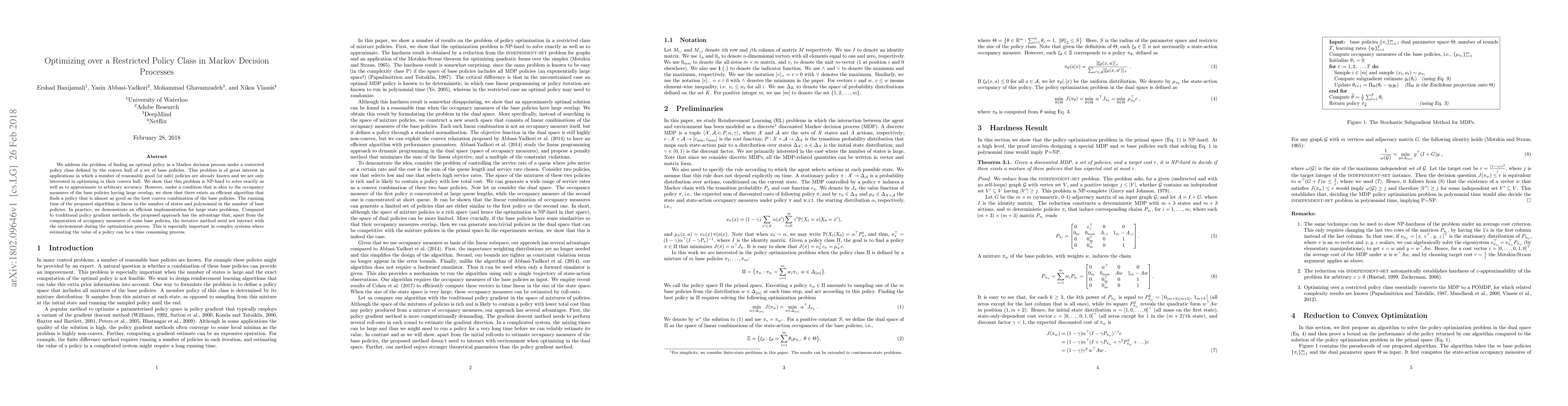 We address the problem of finding an optimal policy in a Markov decision process under a restricted policy class defined by the convex hull of a set of base policies. This problem is of great interest in applications in which a number of reasonably good (or safe) policies are already known and we are only interested in optimizing in their convex hull. We show that this problem is NP-hard to solve exactly as well as to approximate to arbitrary accuracy. However, under a condition that is akin to the occupancy measures of the base policies having large overlap, we show that there exists an efficient algorithm that finds a policy that is almost as good as the best convex combination of the base policies. The running time of the proposed algorithm is linear in the number of states and polynomial in the number of base policies. In practice, we demonstrate an efficient implementation for large state problems. Compared to traditional policy gradient methods, the proposed approach has the advantage that, apart from the computation of occupancy measures of some base policies, the iterative method need not interact with the environment during the optimization process. This is especially important in complex systems where estimating the value of a policy can be a time consuming process.