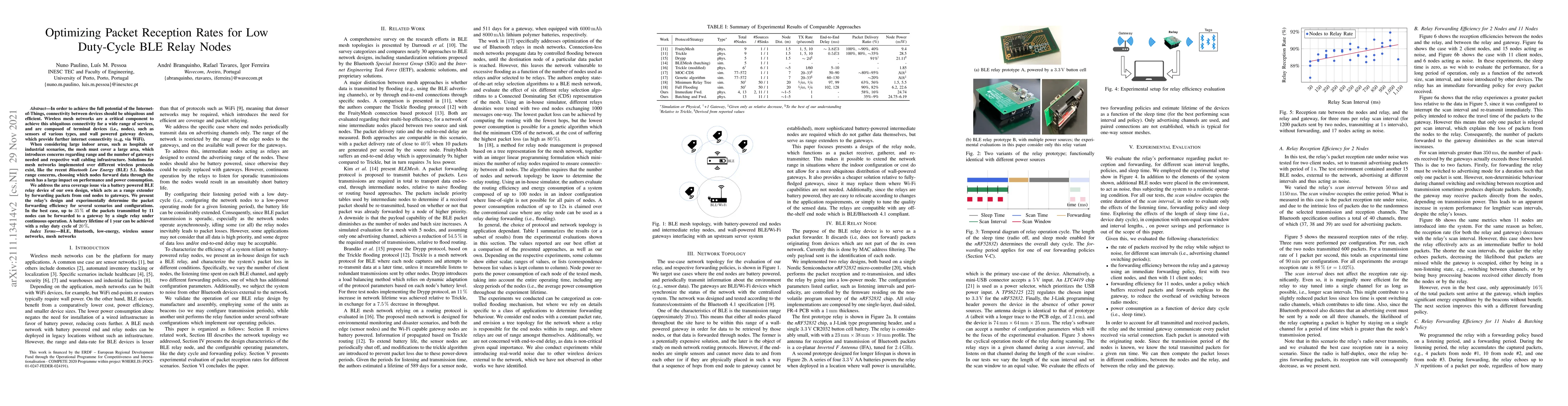 In order to achieve the full potential of the Internet-of-Things, connectivity between devices should be ubiquitous and efficient. Wireless mesh networks are a critical component to achieve this ubiquitous connectivity for a wide range of services, and are composed of terminal devices (i.e., nodes), such as sensors of various types, and wall powered gateway devices, which provide further internet connectivity (e..g, via WiFi). When considering large indoor areas, such as hospitals or industrial scenarios, the mesh must cover a large area, which introduces concerns regarding range and the number of gateways needed and respective wall cabling infrastructure. Solutions for mesh networks implemented over different wireless protocols exist, like the recent Bluetooth Low Energy (BLE) 5.1. Besides range concerns, choosing which nodes forward data through the mesh has a large impact on performance and power consumption. We address the area coverage issue via a battery powered BLE relay device of our own design, which acts as a range extender by forwarding packets from end nodes to gateways. We present the relay's design and experimentally determine the packet forwarding efficiency for several scenarios and configurations. In the best case, up to 35% of the packets transmitted by 11 nodes can be forwarded to a gateway by a single relay under continuous operation. A battery lifetime of 1 year can be achieved with a relay duty cycle of 20%.
