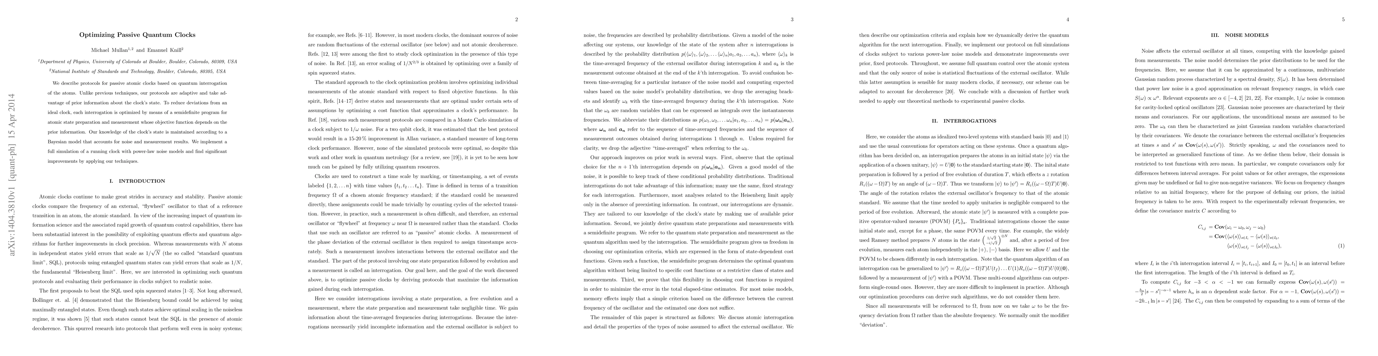 We describe protocols for passive atomic clocks based on quantum interrogation of the atoms. Unlike previous techniques, our protocols are adaptive and take advantage of prior information about the clock's state. To reduce deviations from an ideal clock, each interrogation is optimized by means of a semidefinite program for atomic state preparation and measurement whose objective function depends on the prior information. Our knowledge of the clock's state is maintained according to a Bayesian model that accounts for noise and measurement results. We implement a full simulation of a running clock with power-law noise models and find significant improvements by applying our techniques.
