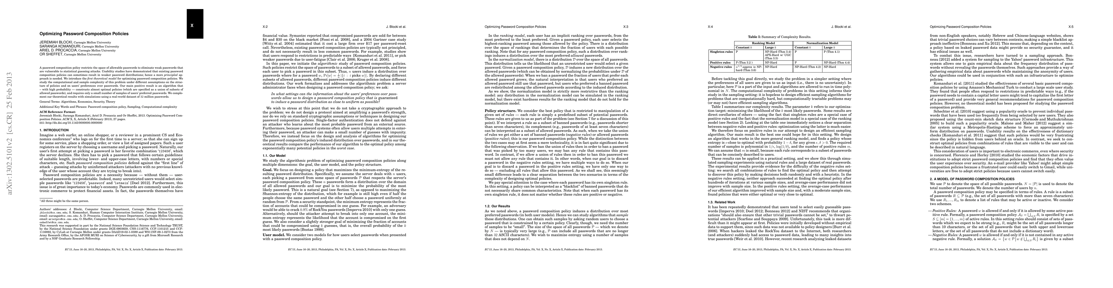 This paper introduces a theoretical model to optimize password composition policies, aiming to improve security while maintaining usability. The authors propose an algorithm that constructs almost optimal policies with minimal user sample data, supported by simulations on a large dataset.