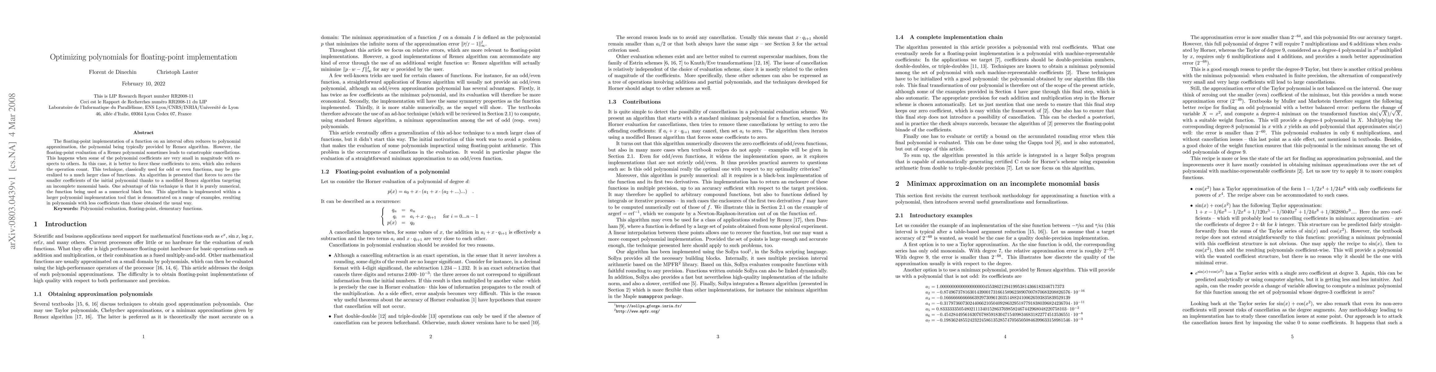 This paper presents an algorithm to optimize polynomial approximations for floating-point evaluation, addressing catastrophic cancellations by forcing smaller coefficients to zero. The method uses a modified Remez algorithm with an incomplete monomial basis, resulting in polynomials with fewer coefficients and improved numerical stability.
