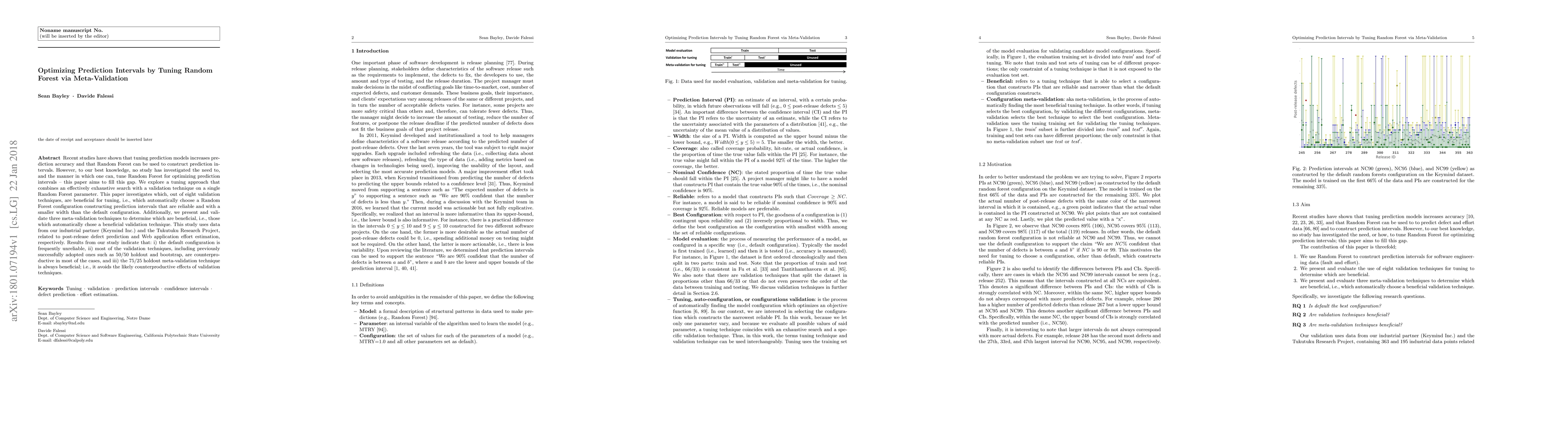 Recent studies have shown that tuning prediction models increases prediction accuracy and that Random Forest can be used to construct prediction intervals. However, to our best knowledge, no study has investigated the need to, and the manner in which one can, tune Random Forest for optimizing prediction intervals { this paper aims to fill this gap. We explore a tuning approach that combines an effectively exhaustive search with a validation technique on a single Random Forest parameter. This paper investigates which, out of eight validation techniques, are beneficial for tuning, i.e., which automatically choose a Random Forest configuration constructing prediction intervals that are reliable and with a smaller width than the default configuration. Additionally, we present and validate three meta-validation techniques to determine which are beneficial, i.e., those which automatically chose a beneficial validation technique. This study uses data from our industrial partner (Keymind Inc.) and the Tukutuku Research Project, related to post-release defect prediction and Web application effort estimation, respectively. Results from our study indicate that: i) the default configuration is frequently unreliable, ii) most of the validation techniques, including previously successfully adopted ones such as 50/50 holdout and bootstrap, are counterproductive in most of the cases, and iii) the 75/25 holdout meta-validation technique is always beneficial; i.e., it avoids the likely counterproductive effects of validation techniques.
