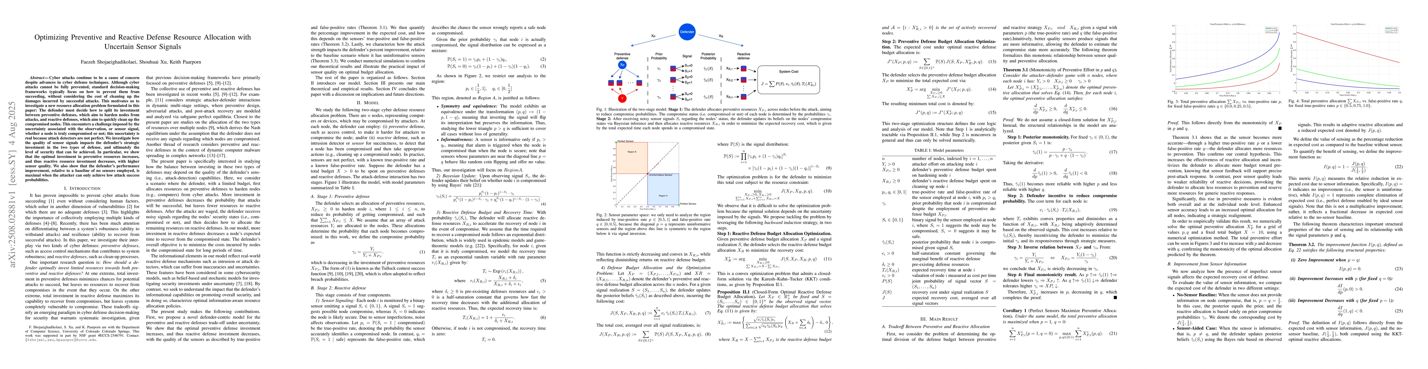 Cyber attacks continue to be a cause of concern despite advances in cyber defense techniques. Although cyber attacks cannot be fully prevented, standard decision-making frameworks typically focus on how to prevent them from succeeding, without considering the cost of cleaning up the damages incurred by successful attacks. This motivates us to investigate a new resource allocation problem formulated in this paper: The defender must decide how to split its investment between preventive defenses, which aim to harden nodes from attacks, and reactive defenses, which aim to quickly clean up the compromised nodes. This encounters a challenge imposed by the uncertainty associated with the observation, or sensor signal, whether a node is truly compromised or not; this uncertainty is real because attack detectors are not perfect. We investigate how the quality of sensor signals impacts the defender's strategic investment in the two types of defense, and ultimately the level of security that can be achieved. In particular, we show that the optimal investment in preventive resources increases, and thus reactive resource investment decreases, with higher sensor quality. We also show that the defender's performance improvement, relative to a baseline of no sensors employed, is maximal when the attacker can only achieve low attack success probabilities.