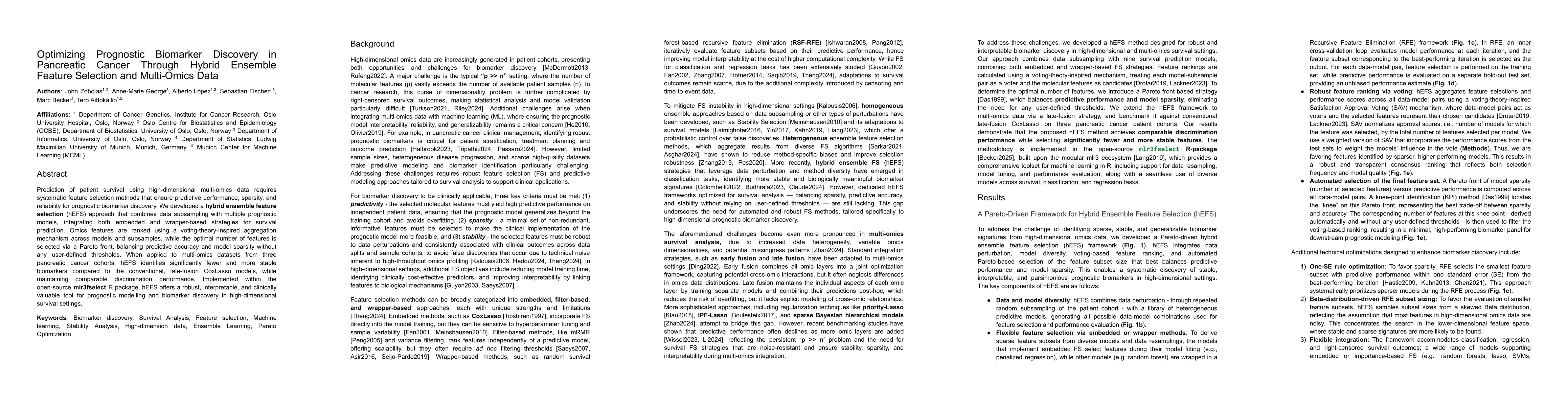 Prediction of patient survival using high-dimensional multi-omics data requires systematic feature selection methods that ensure predictive performance, sparsity, and reliability for prognostic biomarker discovery. We developed a hybrid ensemble feature selection (hEFS) approach that combines data subsampling with multiple prognostic models, integrating both embedded and wrapper-based strategies for survival prediction. Omics features are ranked using a voting-theory-inspired aggregation mechanism across models and subsamples, while the optimal number of features is selected via a Pareto front, balancing predictive accuracy and model sparsity without any user-defined thresholds. When applied to multi-omics datasets from three pancreatic cancer cohorts, hEFS identifies significantly fewer and more stable biomarkers compared to the conventional, late-fusion CoxLasso models, while maintaining comparable discrimination performance. Implemented within the open-source mlr3fselect R package, hEFS offers a robust, interpretable, and clinically valuable tool for prognostic modelling and biomarker discovery in high-dimensional survival settings.