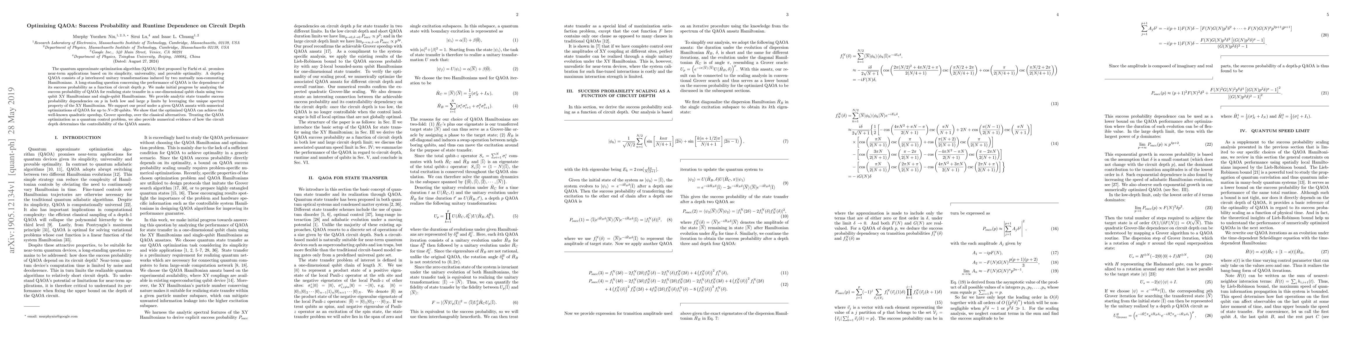 This paper investigates the success probability and runtime of the quantum approximate optimization algorithm (QAOA) as a function of circuit depth, analyzing state transfer in a one-dimensional qubit chain. It provides analytic expressions for success probability in both low and large circuit depths, demonstrating the quadratic speedup over classical alternatives and exploring the controllability of the QAOA ansatz through numerical optimizations.