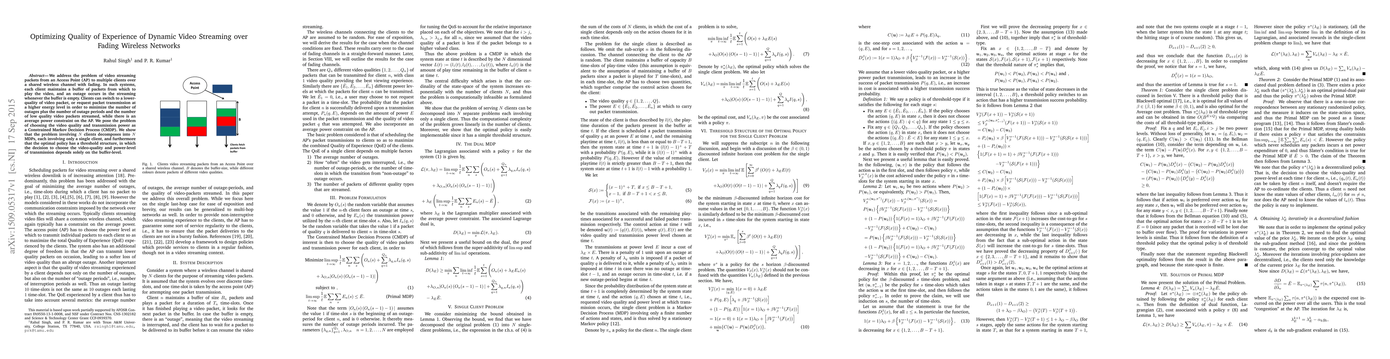 The paper demonstrates that the problem of optimizing QoE in dynamic video streaming over fading wireless networks can be decomposed into independent single-client MDPs, each with a threshold-based optimal policy.