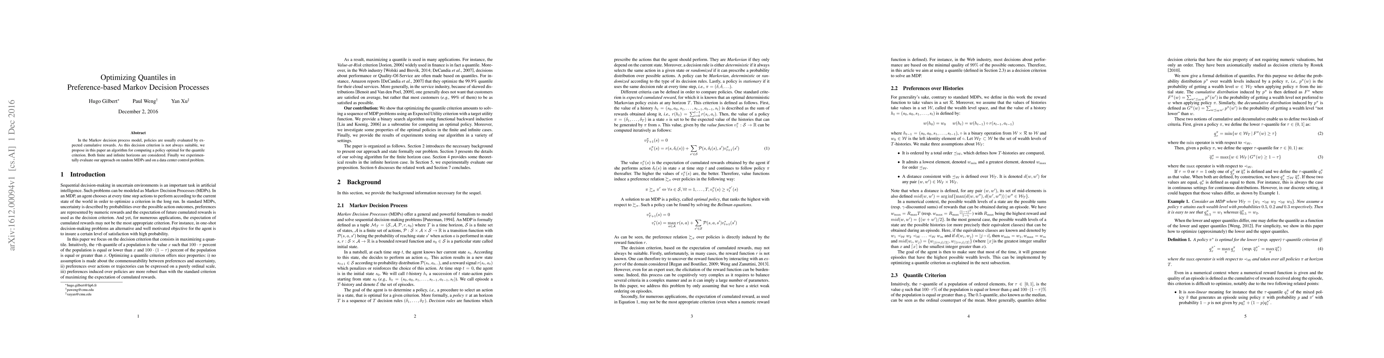 This paper proposes an algorithm to compute optimal policies in Markov Decision Processes (MDPs) based on quantile criteria, applicable to both finite and infinite horizons, and evaluates it experimentally on random MDPs and a data center control problem. The traditional reward-based evaluation is supplemented with a more nuanced quantile-based approach.
