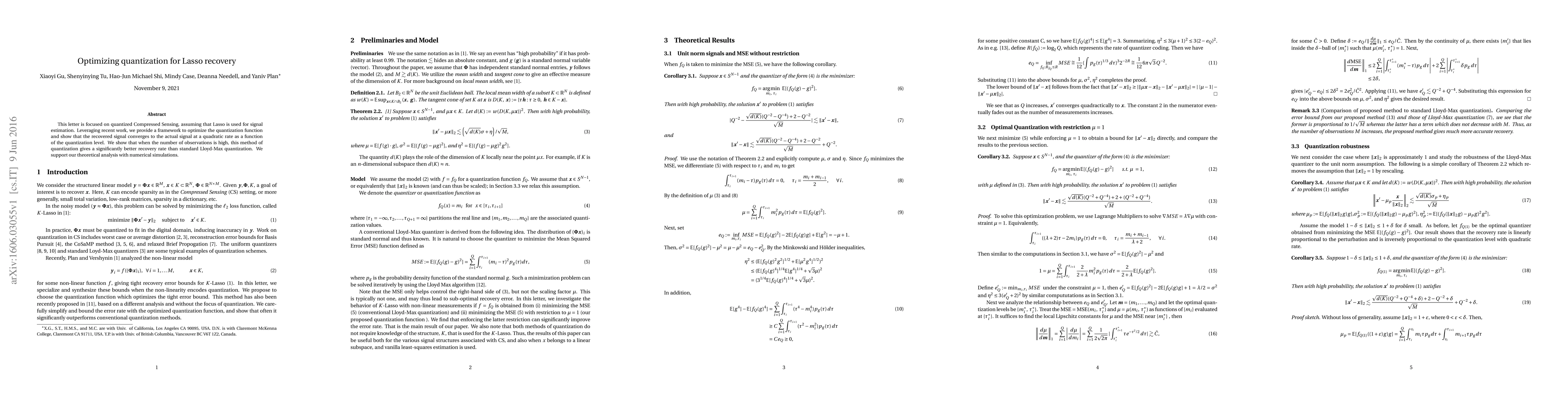 Researchers optimize quantization for signal estimation using Lasso recovery, showing a faster convergence rate than standard Lloyd-Max quantization when the number of observations is high.