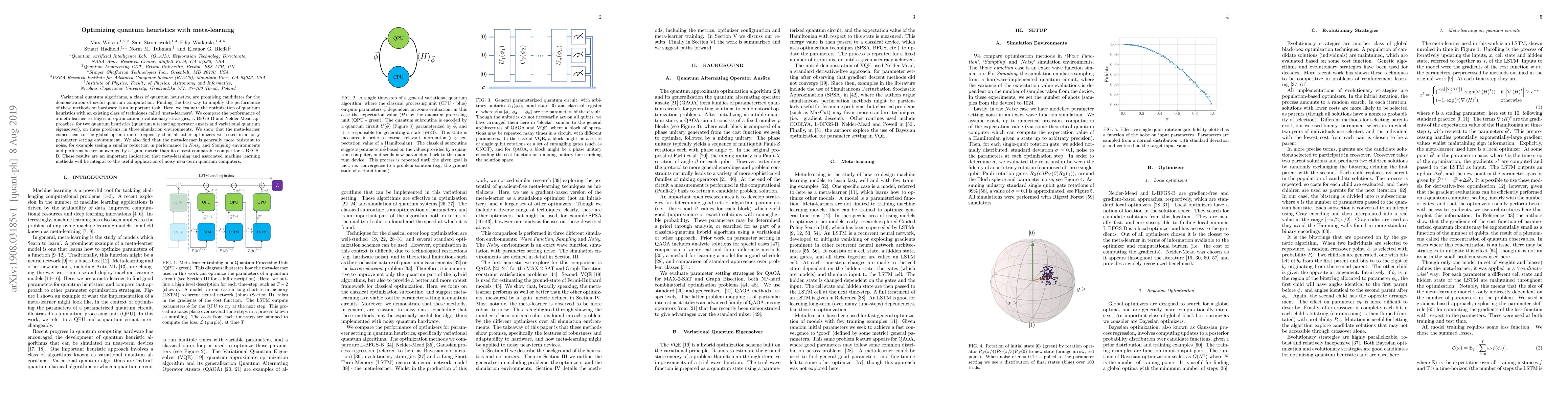 Variational quantum algorithms, a class of quantum heuristics, are promising candidates for the demonstration of useful quantum computation. Finding the best way to amplify the performance of these methods on hardware is an important task. Here, we evaluate the optimization of quantum heuristics with an existing class of techniques called `meta-learners'. We compare the performance of a meta-learner to Bayesian optimization, evolutionary strategies, L-BFGS-B and Nelder-Mead approaches, for two quantum heuristics (quantum alternating operator ansatz and variational quantum eigensolver), on three problems, in three simulation environments. We show that the meta-learner comes near to the global optima more frequently than all other optimizers we tested in a noisy parameter setting environment. We also find that the meta-learner is generally more resistant to noise, for example seeing a smaller reduction in performance in Noisy and Sampling environments and performs better on average by a `gain' metric than its closest comparable competitor L-BFGS-B. These results are an important indication that meta-learning and associated machine learning methods will be integral to the useful application of noisy near-term quantum computers.