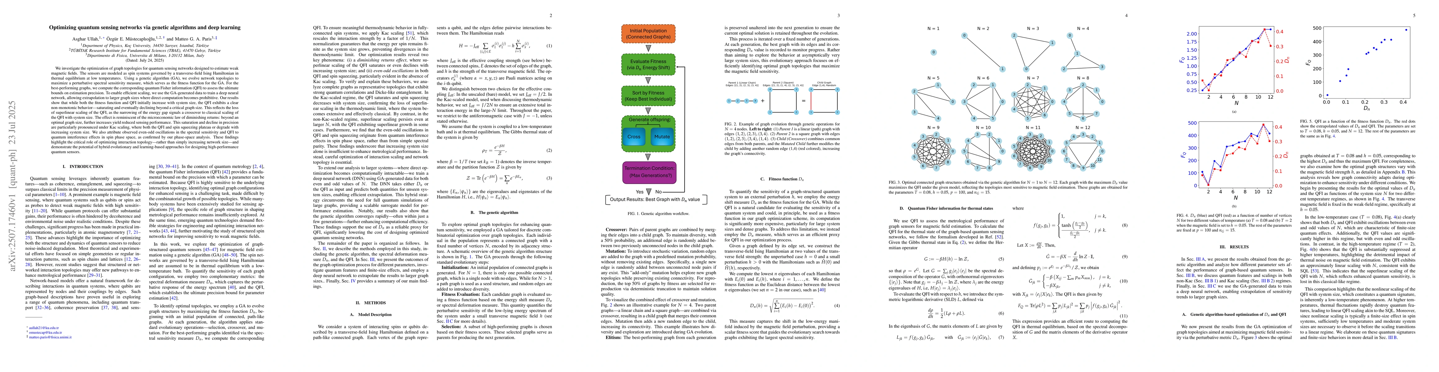 We investigate the optimization of graph topologies for quantum sensing networks designed to estimate weak magnetic fields. The sensors are modeled as spin systems governed by a transverse-field Ising Hamiltonian in thermal equilibrium at low temperatures. Using a genetic algorithm (GA), we evolve network topologies to maximize a perturbative spectral sensitivity measure, which serves as the fitness function for the GA. For the best-performing graphs, we compute the corresponding quantum Fisher information (QFI) to assess the ultimate bounds on estimation precision. To enable efficient scaling, we use the GA-generated data to train a deep neural network, allowing extrapolation to larger graph sizes where direct computation becomes prohibitive. Our results show that while both the fitness function and QFI initially increase with system size, the QFI exhibits a clear non-monotonic behavior - saturating and eventually declining beyond a critical graph size. This reflects the loss of superlinear scaling of the QFI, as the narrowing of the energy gap signals a crossover to classical scaling of the QFI with system size. The effect is reminiscent of the microeconomic law of diminishing returns: beyond an optimal graph size, further increases yield reduced sensing performance. This saturation and decline in precision are particularly pronounced under Kac scaling, where both the QFI and spin squeezing plateau or degrade with increasing system size. We also attribute observed even-odd oscillations in the spectral sensitivity and QFI to quantum interference effects in spin phase space, as confirmed by our phase-space analysis. These findings highlight the critical role of optimizing interaction topology - rather than simply increasing network size - and demonstrate the potential of hybrid evolutionary and learning-based approaches for designing high-performance quantum sensors.