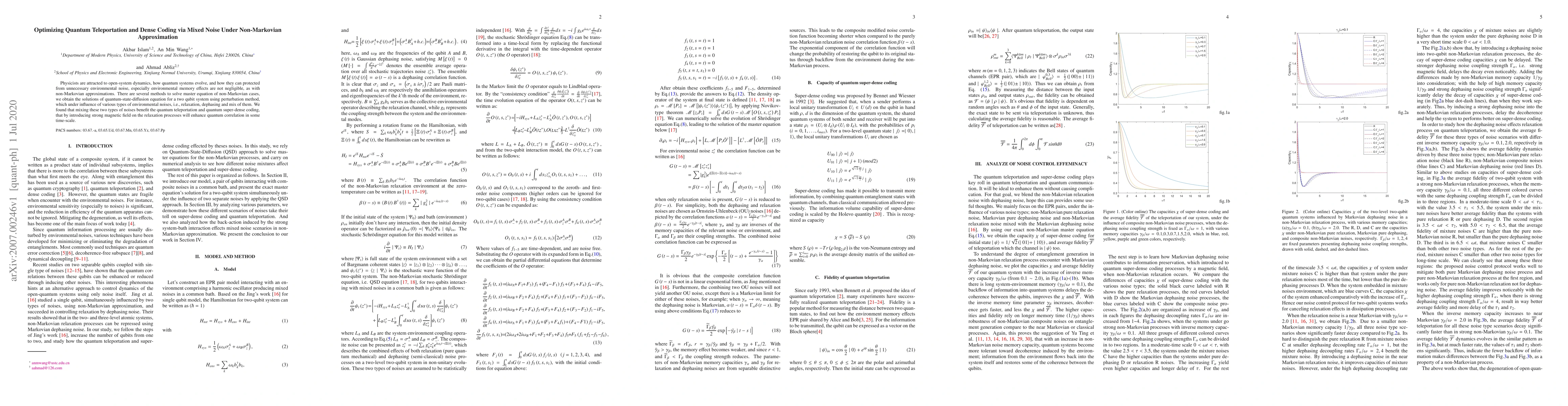 This paper explores optimizing quantum teleportation and dense coding under mixed noise conditions using non-Markovian approximations. The authors solve the quantum-state-diffusion equation for a two-qubit system, finding that mixed relaxation and dephasing noise, along with a strong magnetic field, can enhance quantum correlations and improve these quantum communication protocols.