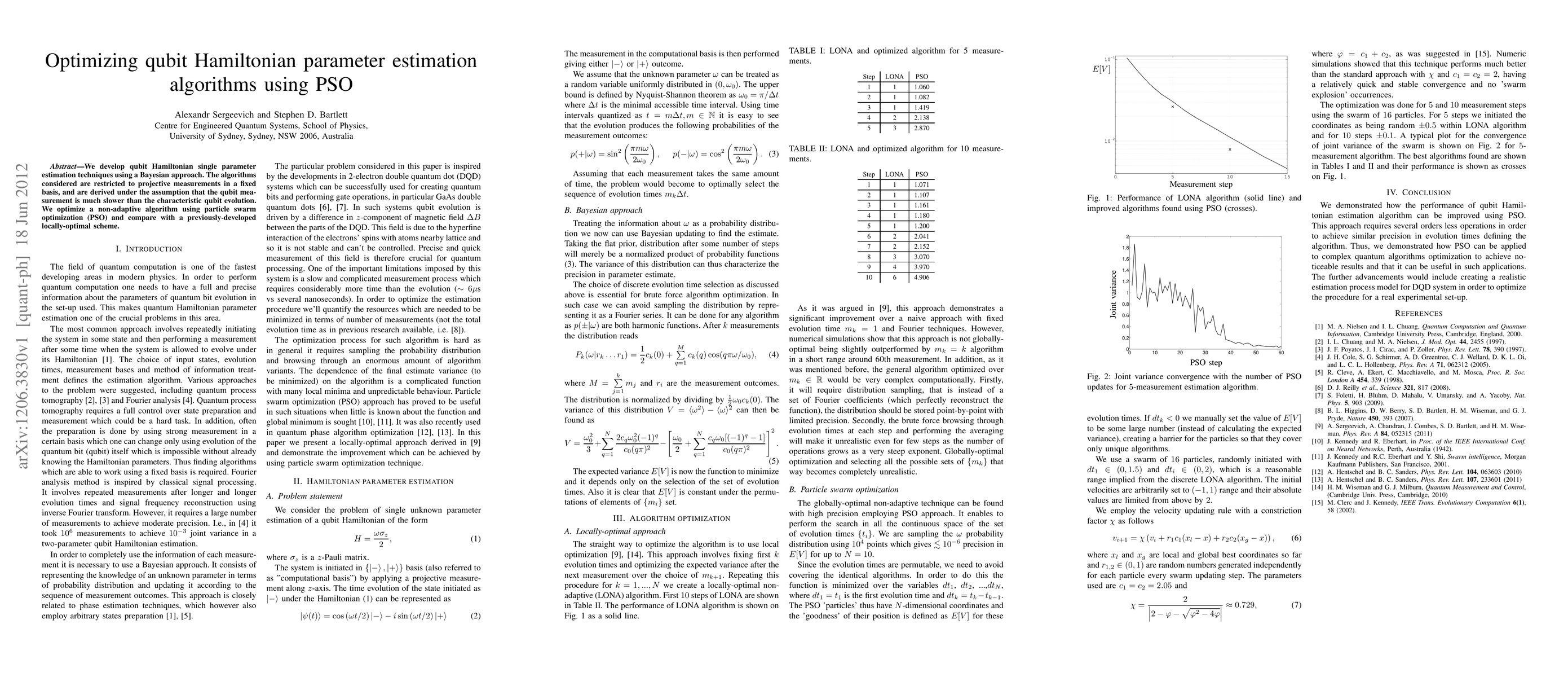 The application of PSO for optimizing qubit Hamiltonian parameter estimation algorithms, achieving significant improvements in performance and efficiency.