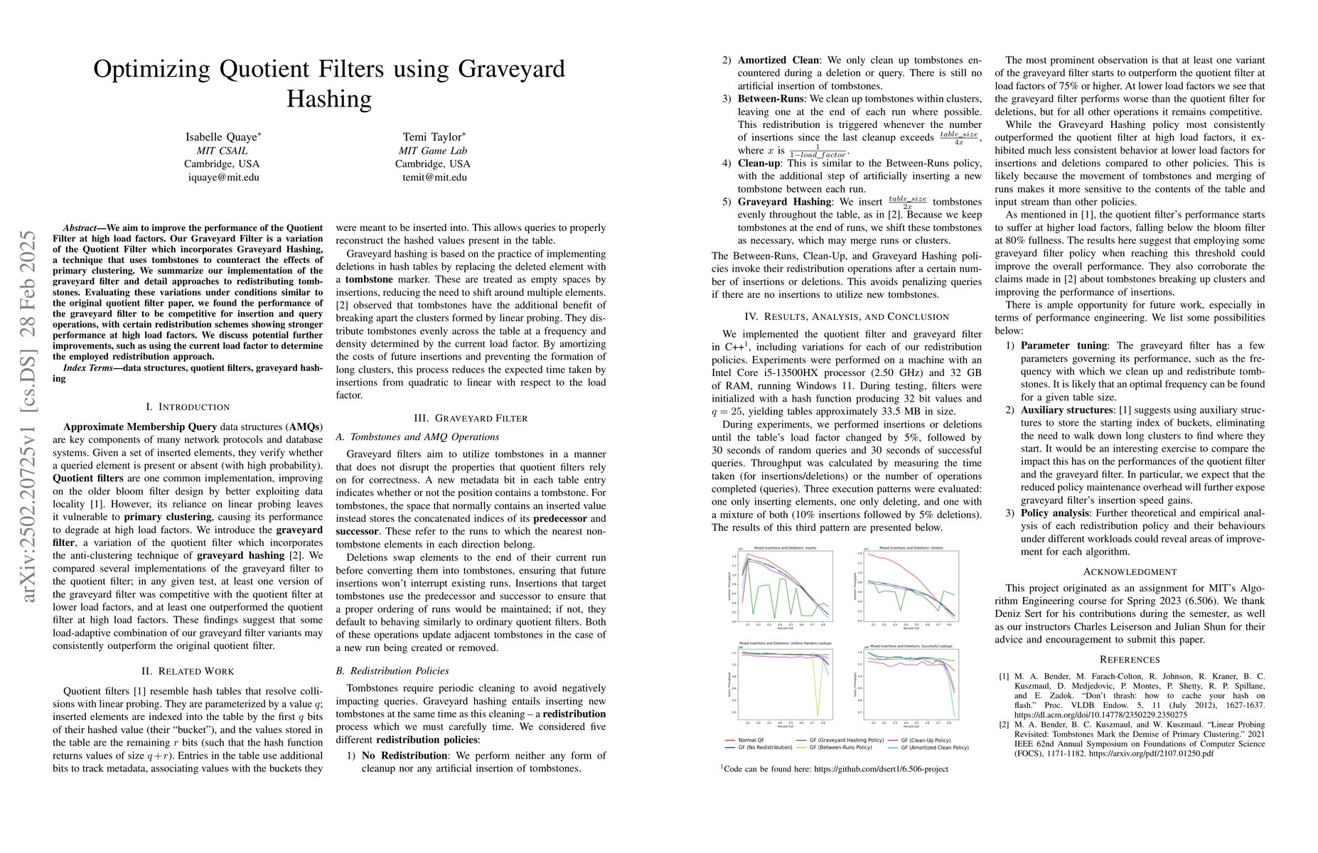 The research implemented both Quotient Filter and Graveyard Filter in C++, comparing their performance under various load factors and insertion/deletion patterns. Experiments were conducted on a Windows 11 machine with an Intel Core i5-13500HX processor and 32GB RAM.