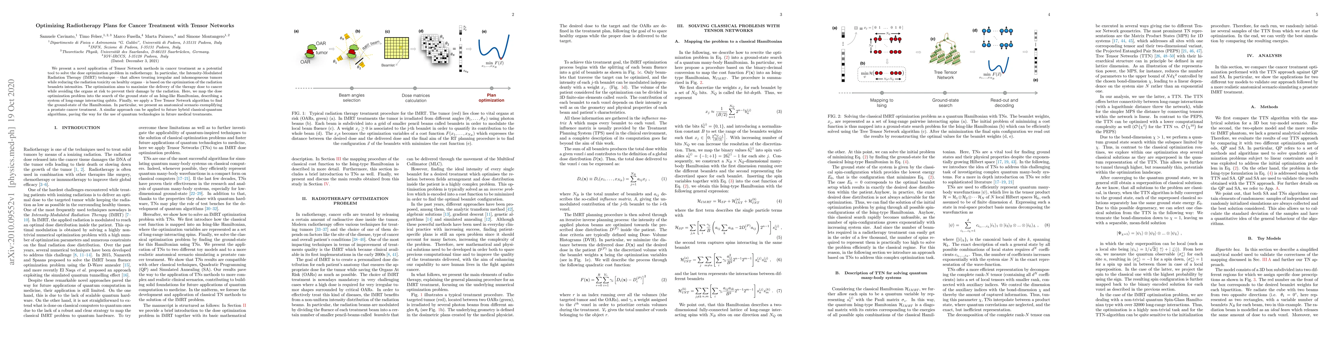 This paper introduces Tensor Network methods to optimize radiotherapy plans for cancer treatment, specifically for Intensity-Modulated Radiation Therapy (IMRT). It uses a Tree Tensor Network algorithm to solve the dose optimization problem by mapping it to the ground state of an Ising-like Hamiltonian, demonstrating its application in a prostate cancer scenario.