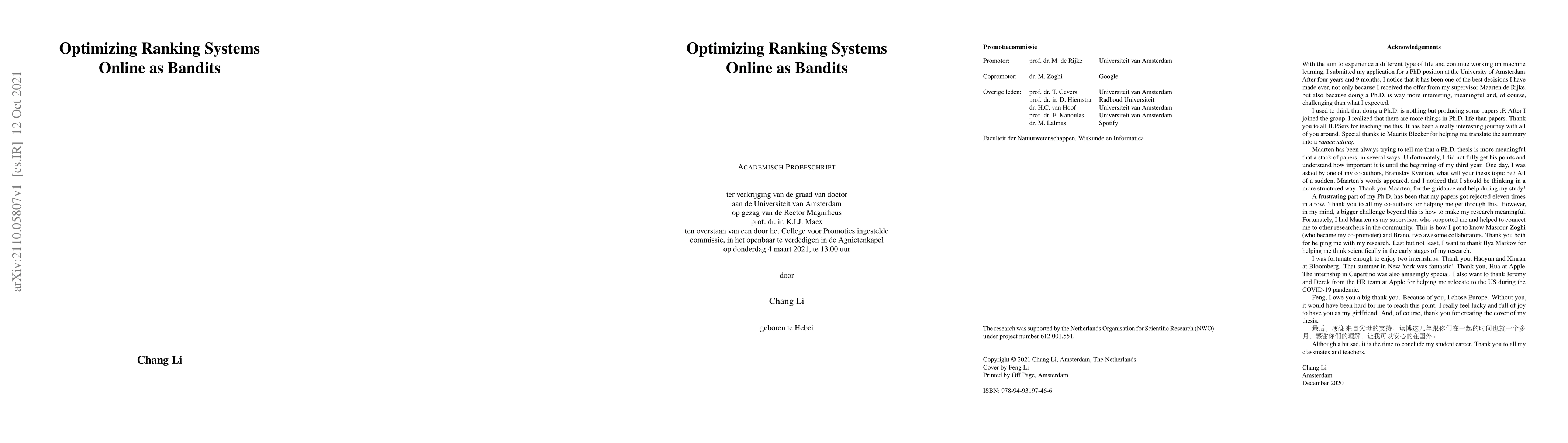 This paper proposes solutions to optimize ranking systems online using bandit algorithms, addressing challenges such as effectiveness, safety, nonstationarity, and diversification. It introduces the MergeDTS algorithm for effective learning, BubbleRank for safe content display, CascadeDUCB and CascadeSWUCB for handling nonstationarity, and CascadeHybrid for results diversification.
