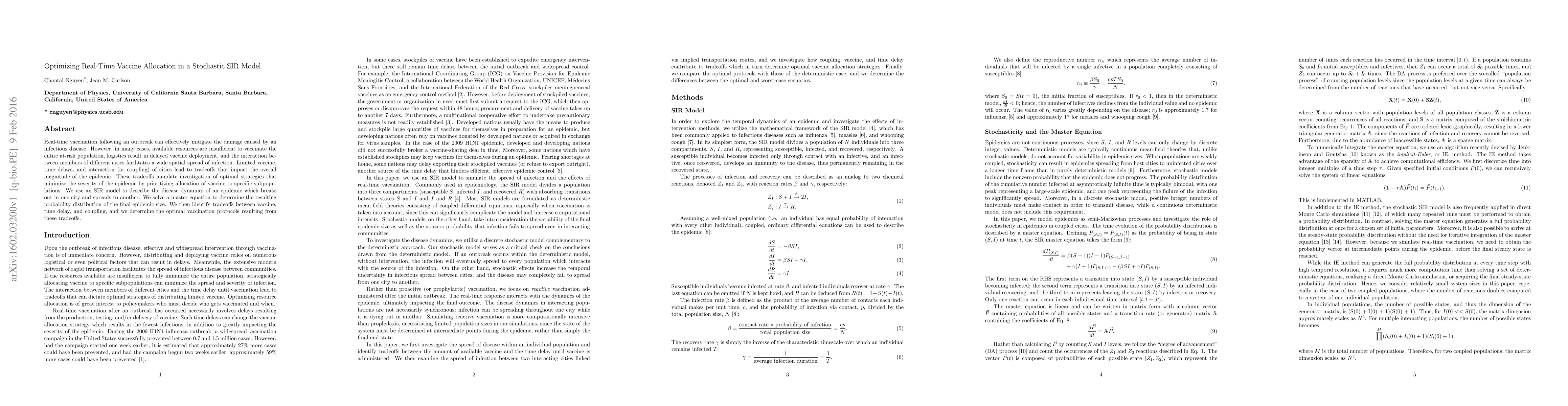 This paper investigates optimal real-time vaccine allocation strategies in a stochastic SIR model to mitigate the spread of an epidemic, considering limited resources, time delays, and inter-city interactions. The study identifies optimal vaccination protocols that balance these factors to minimize epidemic severity.