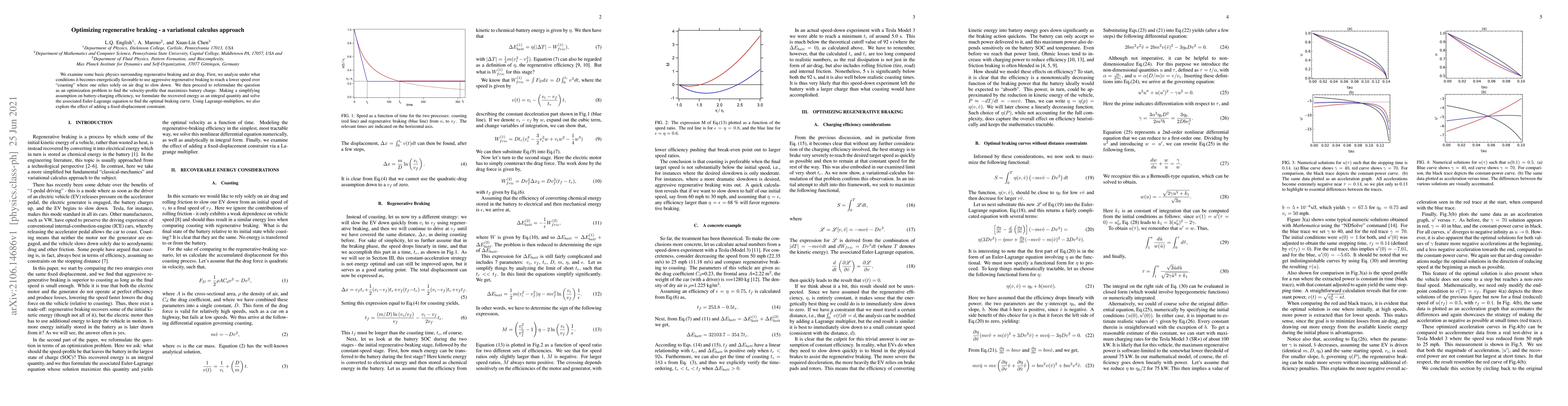This paper optimizes regenerative braking using variational calculus to determine the most efficient velocity profile for maximizing battery charge, comparing it to coasting solely on air drag. The study solves the Euler-Lagrange equation under a fixed-displacement constraint to find the optimal braking curve.