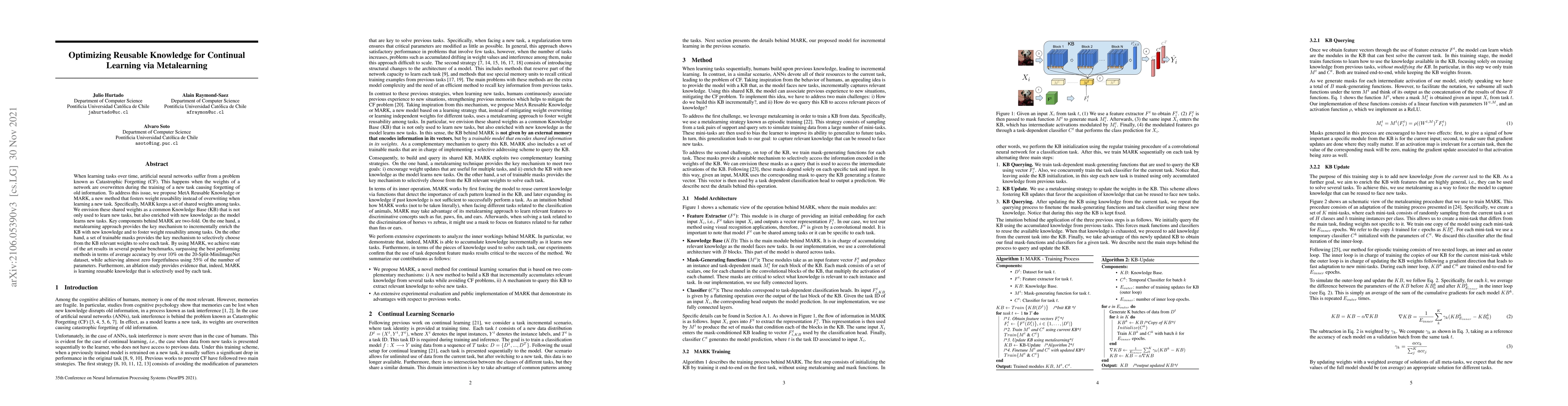 A new method called MARK (Meta A Reusable Knowledge) helps artificial neural networks learn from multiple tasks without forgetting previous knowledge, achieving state-of-the-art results with only 55% of the original number of parameters.