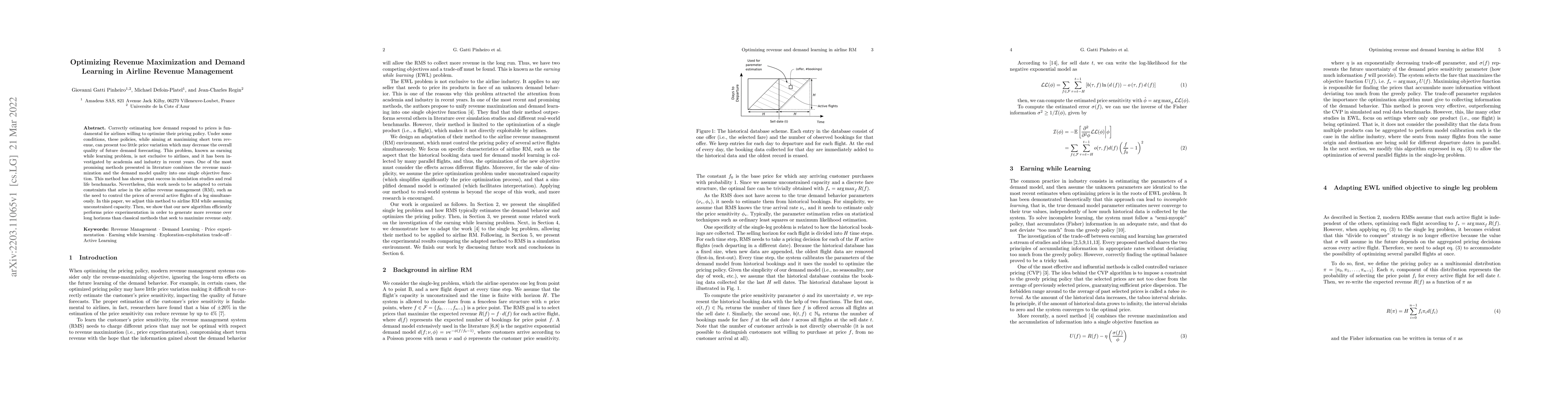 This paper proposes an optimized method for airline revenue management that integrates revenue maximization with demand learning, addressing the challenge of insufficient price variation that hampers future demand forecasting. The new algorithm effectively conducts price experimentation to generate higher long-term revenue compared to traditional revenue-maximizing methods.