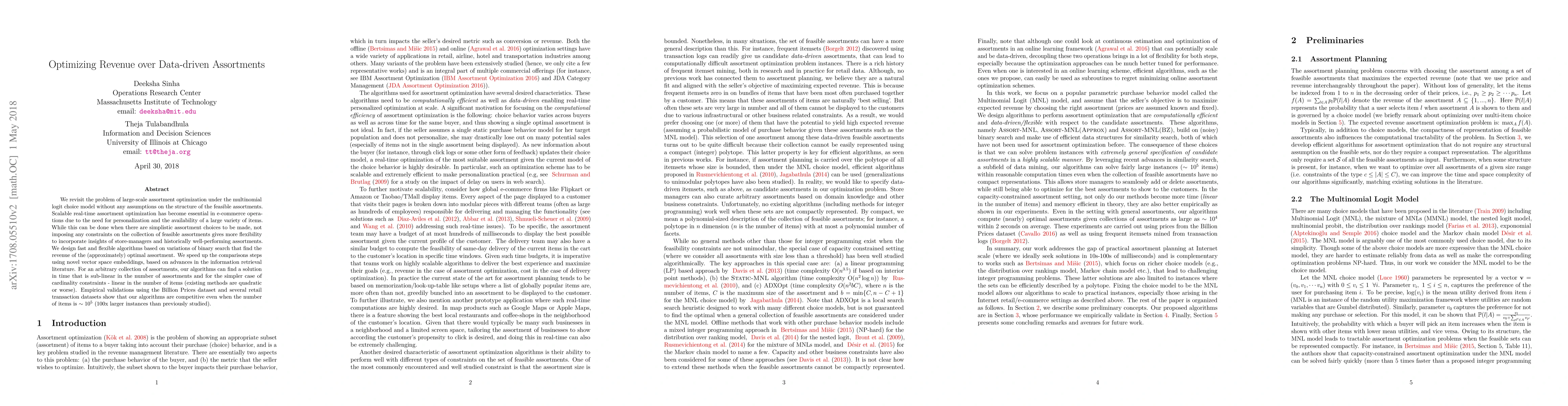 We revisit the problem of large-scale assortment optimization under the multinomial logit choice model without any assumptions on the structure of the feasible assortments. Scalable real-time assortment optimization has become essential in e-commerce operations due to the need for personalization and the availability of a large variety of items. While this can be done when there are simplistic assortment choices to be made, not imposing any constraints on the collection of feasible assortments gives more flexibility to incorporate insights of store-managers and historically well-performing assortments. We design fast and flexible algorithms based on variations of binary search that find the revenue of the (approximately) optimal assortment. We speed up the comparisons steps using novel vector space embeddings, based on advances in the information retrieval literature. For an arbitrary collection of assortments, our algorithms can find a solution in time that is sub-linear in the number of assortments and for the simpler case of cardinality constraints - linear in the number of items (existing methods are quadratic or worse). Empirical validations using the Billion Prices dataset and several retail transaction datasets show that our algorithms are competitive even when the number of items is $\sim 10^5$ ($100$x larger instances than previously studied).
