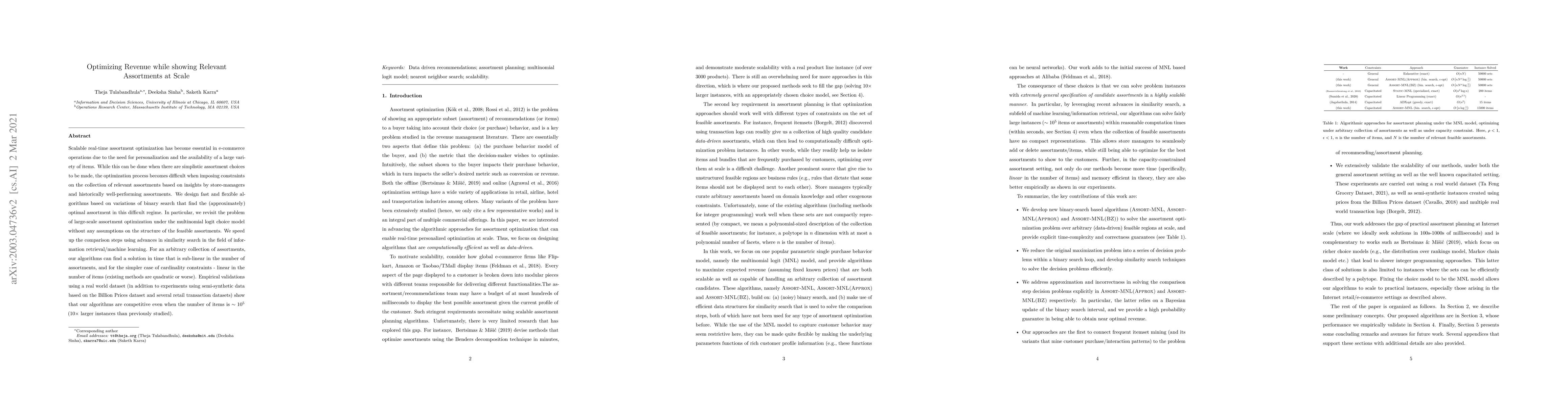 Scalable real-time assortment optimization has become essential in e-commerce operations due to the need for personalization and the availability of a large variety of items. While this can be done when there are simplistic assortment choices to be made, the optimization process becomes difficult when imposing constraints on the collection of relevant assortments based on insights by store-managers and historically well-performing assortments. We design fast and flexible algorithms based on variations of binary search that find the (approximately) optimal assortment in this difficult regime. In particular, we revisit the problem of large-scale assortment optimization under the multinomial logit choice model without any assumptions on the structure of the feasible assortments. We speed up the comparison steps using advances in similarity search in the field of information retrieval/machine learning. For an arbitrary collection of assortments, our algorithms can find a solution in time that is sub-linear in the number of assortments, and for the simpler case of cardinality constraints - linear in the number of items (existing methods are quadratic or worse). Empirical validations using a real world dataset (in addition to experiments using semi-synthetic data based on the Billion Prices dataset and several retail transaction datasets) show that our algorithms are competitive even when the number of items is $\sim 10^5$ ($10\times$ larger instances than previously studied).