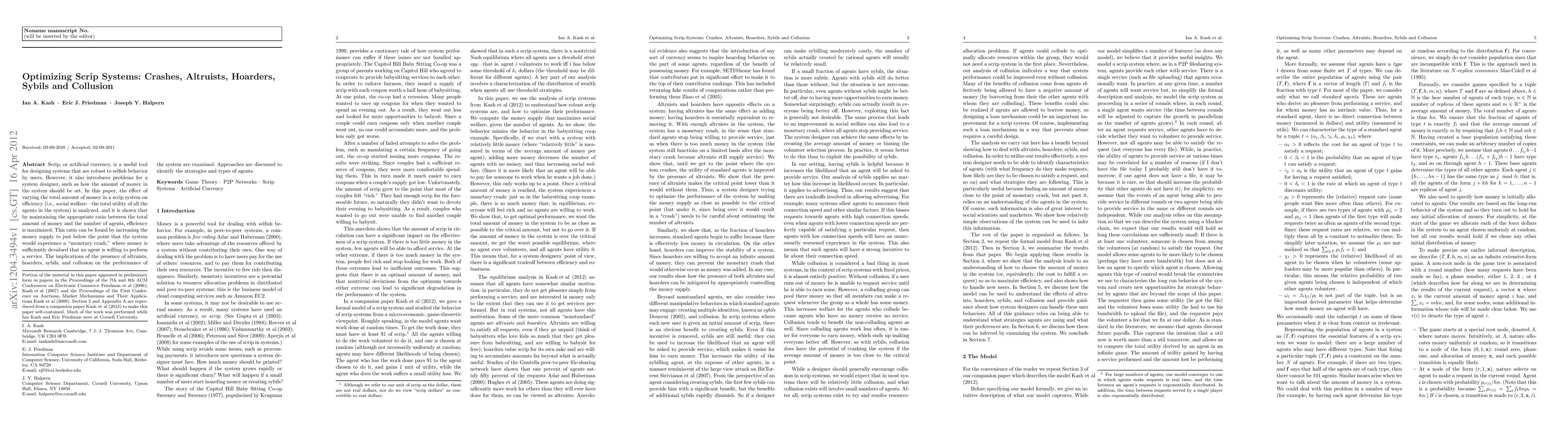 This paper investigates how adjusting the total amount of money in a scrip system affects efficiency, demonstrating that maximizing social welfare occurs when the money supply is set just below the threshold for a "monetary crash." It also examines the impact of altruists, hoarders, sybils, and collusion on system performance, proposing methods to identify and strategize against these agent types.
