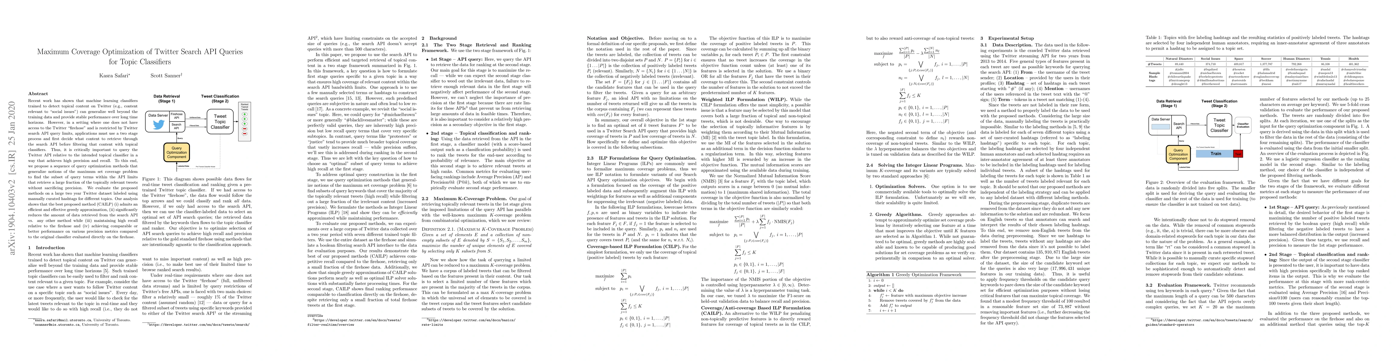 Twitter has grown to become an important platform to access immediate information about major events and dynamic topics. As one example, recent work has shown that classifiers trained to detect topical content on Twitter can generalize well beyond the training data. Since access to Twitter data is hidden behind a limited search API, it is impossible (for most users) to apply these classifiers directly to the Twitter unfiltered data streams ("firehose"). Rather, applications must first decide what content to retrieve through the search API before filtering that content with topical classifiers. Thus, it is critically important to query the Twitter API relative to the intended topical classifier in a way that minimizes the amount of negatively classified data retrieved. In this paper, we propose a sequence of query optimization methods that generalize notions of the maximum coverage problem to find the subset of query terms within the API limits that cover most of the topically relevant tweets without sacrificing precision. We evaluate the proposed methods on a large dataset of Twitter data collected during 2013 and 2014 labeled using manually curated hashtags for eight topics. Among many insights, our analysis shows that the best of the proposed methods can significantly outperform the firehose on precision and F1-score while achieving high recall within strict API limitations.