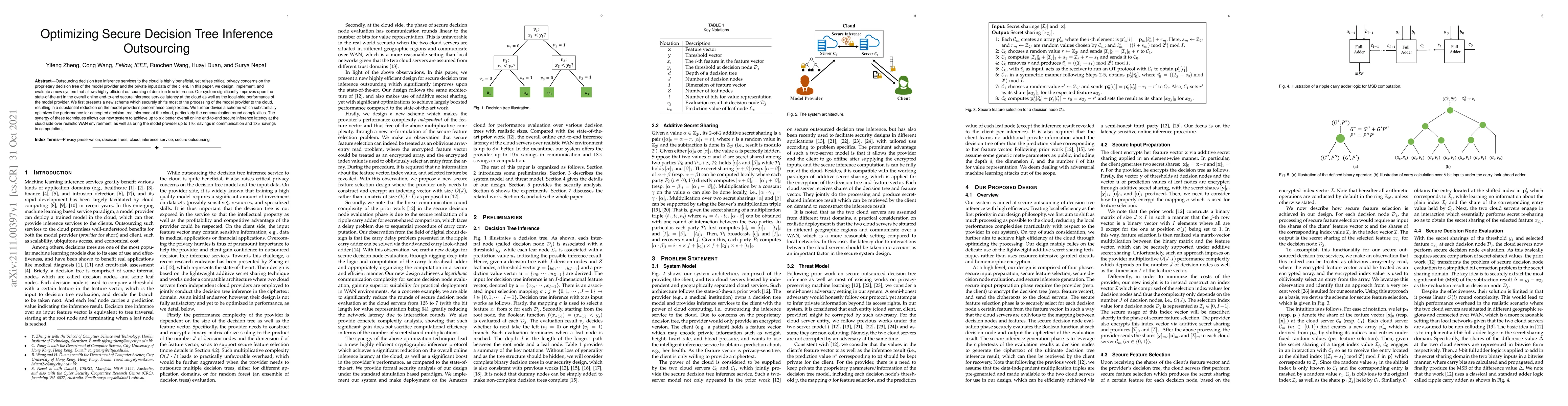 This paper introduces a new system for efficient outsourcing of secure decision tree inference to the cloud, significantly reducing latency and improving performance for both the cloud and the model provider. The system optimizes processing by shifting most tasks to the cloud and enhances encrypted inference performance, achieving up to 8x better latency and substantial savings in communication and computation for the model provider.