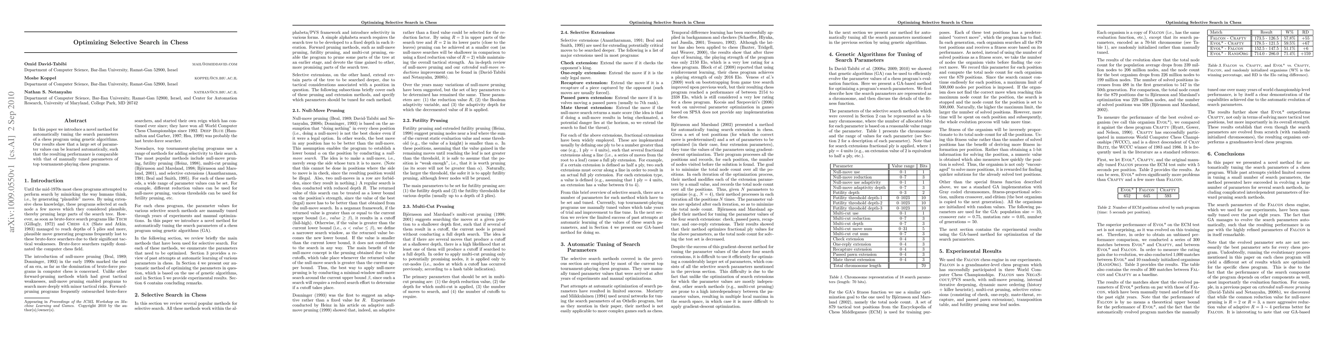 This paper presents a genetic algorithm-based method for automatically optimizing the search parameters of a chess program, achieving performance comparable to manually tuned parameters used in top-level chess competitions. The approach demonstrates the potential for automated tuning in complex search scenarios.
