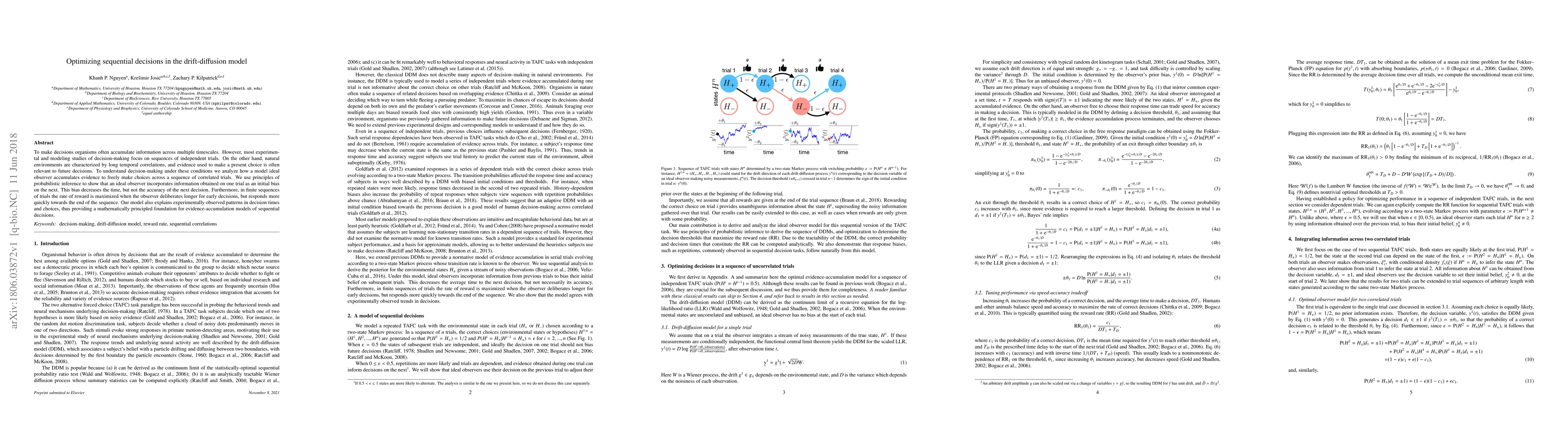 To make decisions organisms often accumulate information across multiple timescales. However, most experimental and modeling studies of decision-making focus on sequences of independent trials. On the other hand, natural environments are characterized by long temporal correlations, and evidence used to make a present choice is often relevant to future decisions. To understand decision-making under these conditions we analyze how a model ideal observer accumulates evidence to freely make choices across a sequence of correlated trials. We use principles of probabilistic inference to show that an ideal observer incorporates information obtained on one trial as an initial bias on the next. This bias decreases the time, but not the accuracy of the next decision. Furthermore, in finite sequences of trials the rate of reward is maximized when the observer deliberates longer for early decisions, but responds more quickly towards the end of the sequence. Our model also explains experimentally observed patterns in decision times and choices, thus providing a mathematically principled foundation for evidence-accumulation models of sequential decisions.