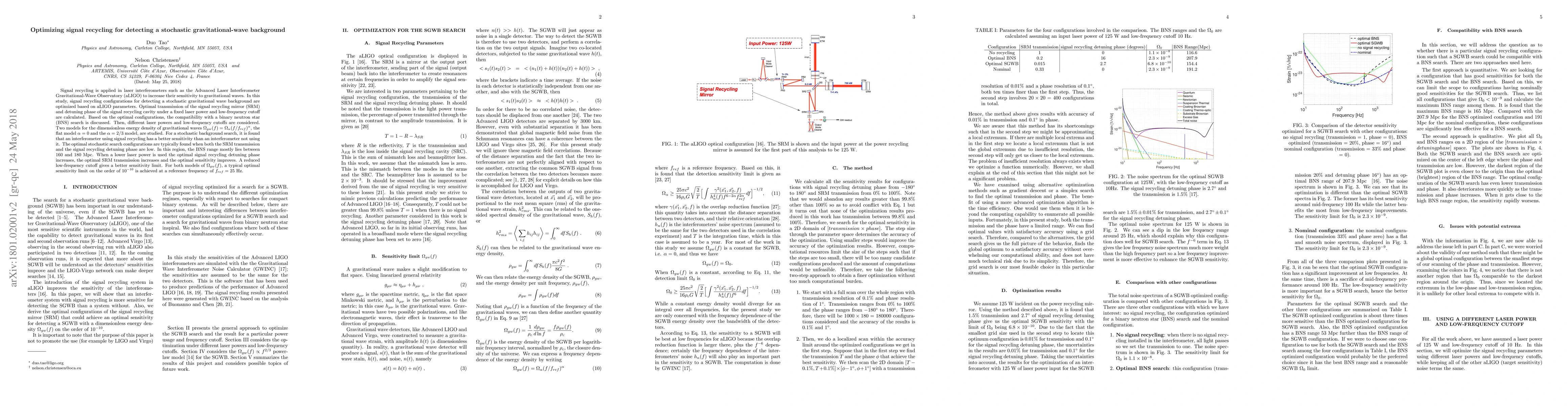This study optimizes signal recycling configurations in aLIGO to enhance detection of a stochastic gravitational wave background, finding that optimal configurations yield better sensitivity than non-recycled interferometers. The best sensitivity is achieved with low signal recycling mirror transmission and detuning phase, with a typical limit of $10^{-10}$ at 25 Hz.
