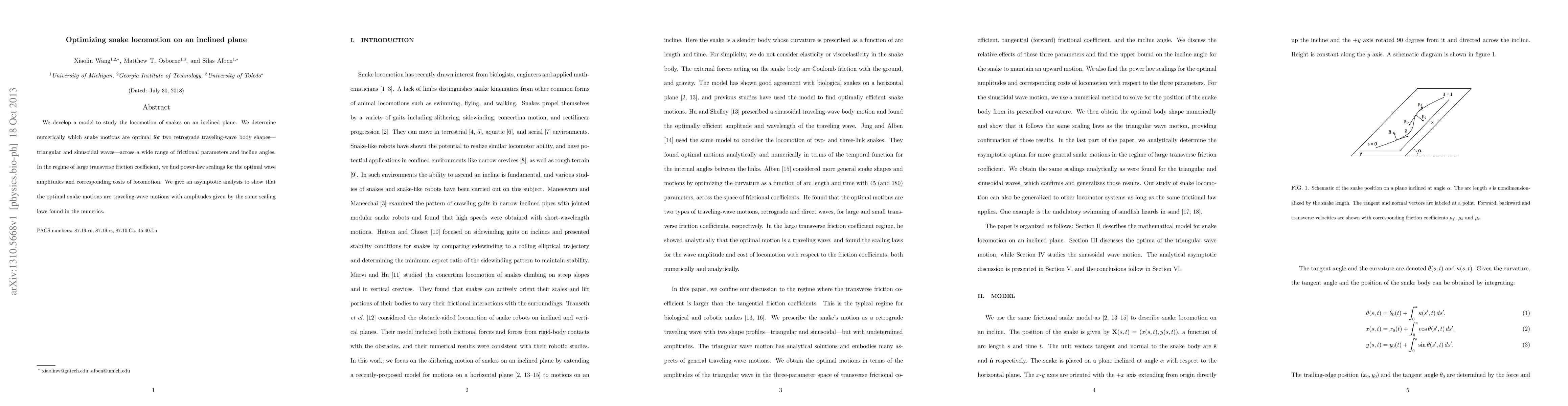 A study models snake locomotion on inclined planes, finding optimal wave motions for two body shapes that scale with friction and incline angles, offering insights into efficient snake movement.