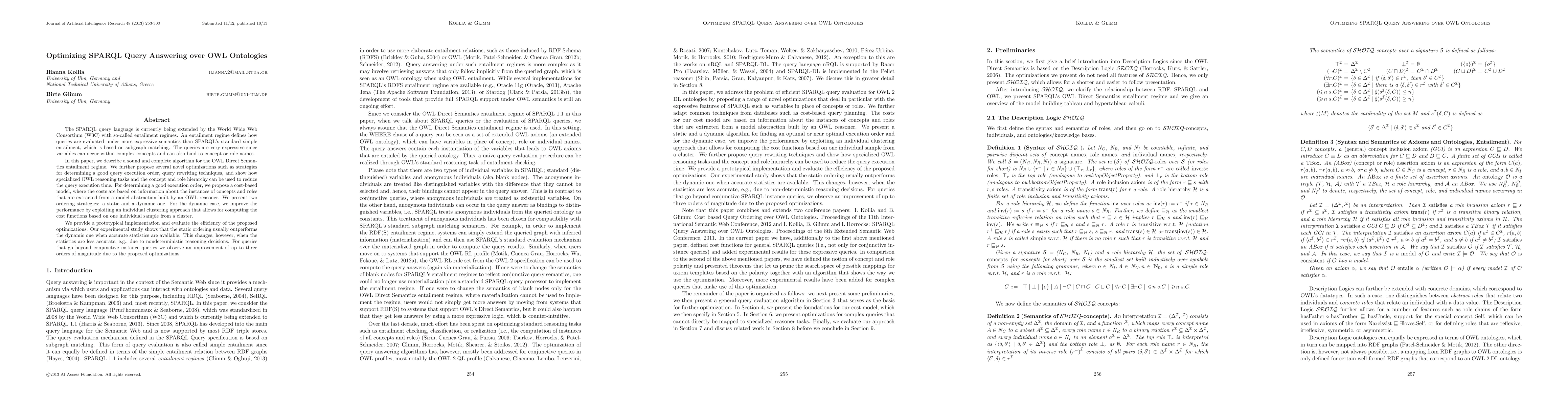 This paper presents a sound and complete algorithm for evaluating SPARQL queries under the OWL Direct Semantics entailment regime, proposing optimizations like query execution order strategies and query rewriting techniques. Experimental results show significant performance improvements, especially for complex queries, though static ordering generally outperforms dynamic ordering when accurate statistics are available.
